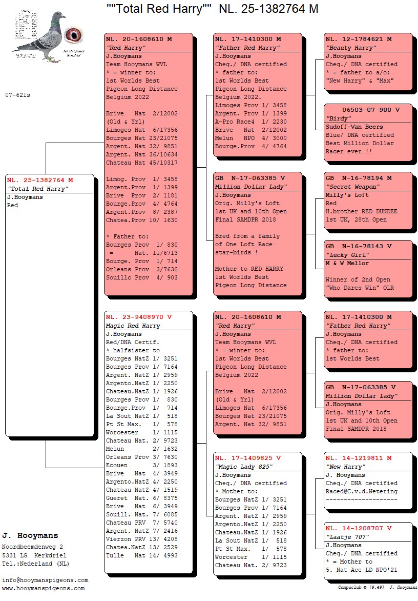 出自: ”红哈利”, 全国长距离鸽王冠军, 1位省赛 3.458 羽, 1位省赛3.458 羽, 2位全国12.002羽, 4位省赛4.764 羽, 作出子代: 1位省赛 830 羽, 1位省赛 714 羽, 3位省赛 7.630 羽 x ”神奇红哈利”, 父亲 ”红哈利”, 全国长距离鸽王冠军