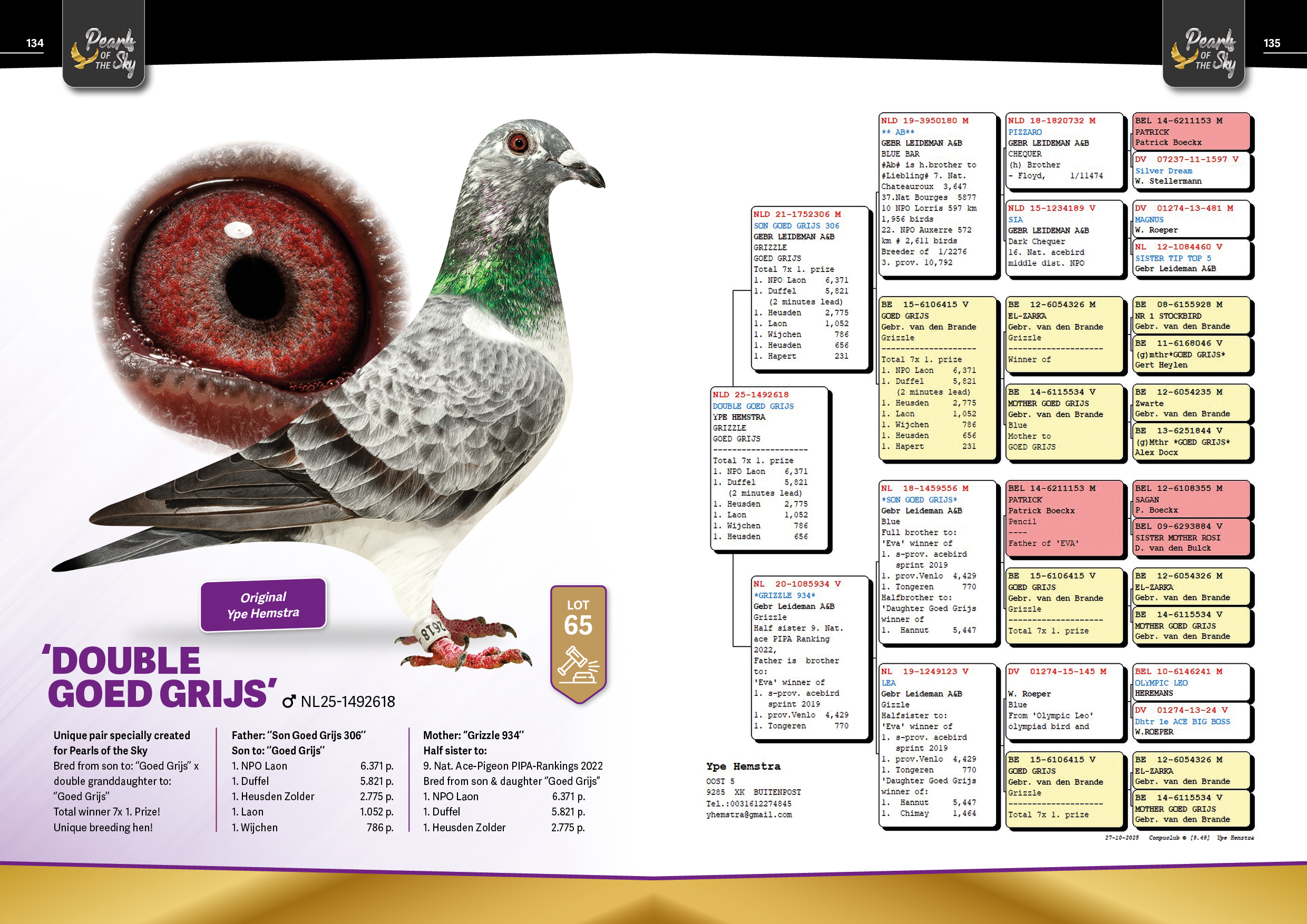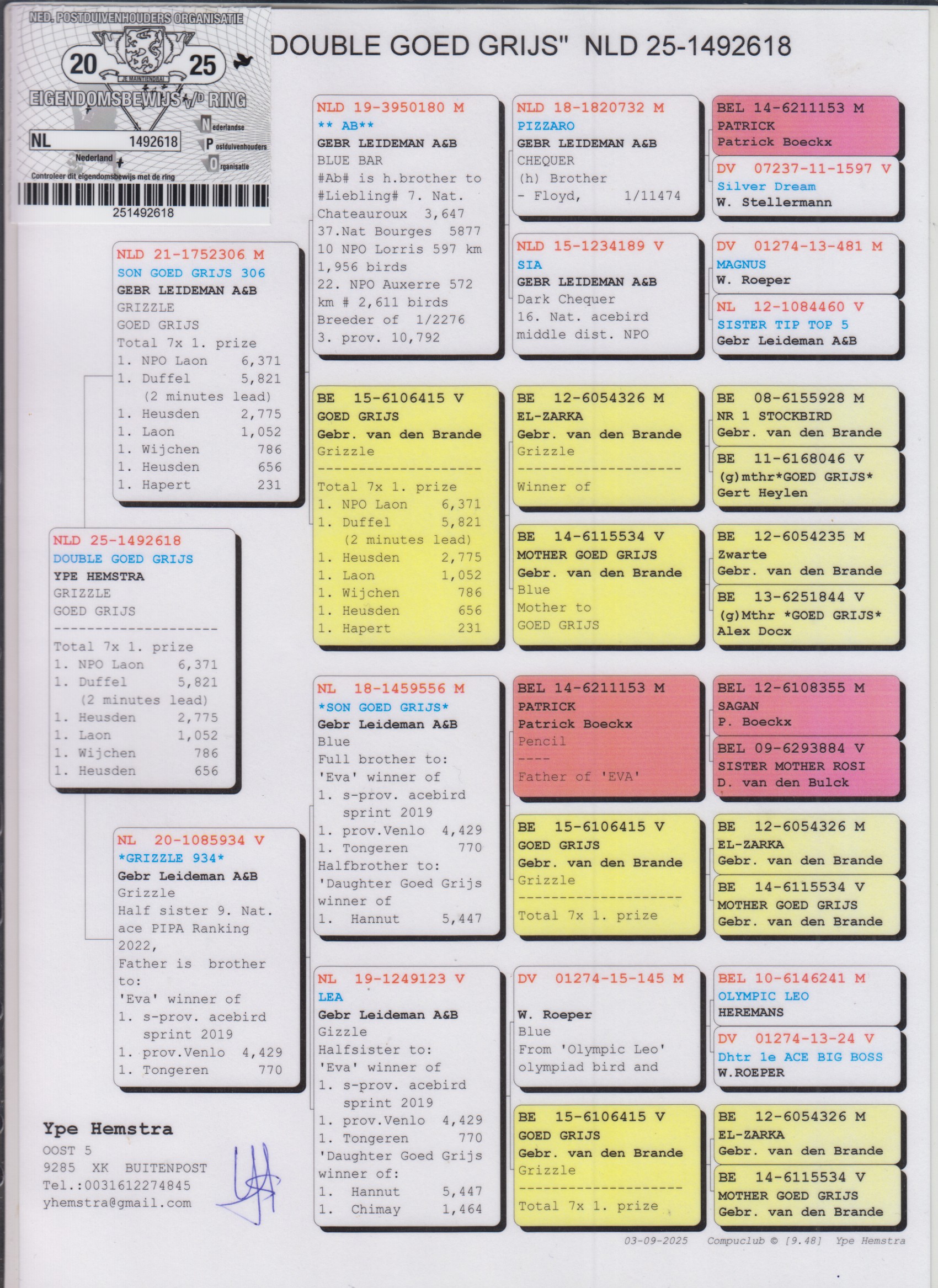 Uit: ”Son Goed Grijs 306”, zoon ”Goed Grijs”, 7x 1. Prijs & 1. NPO Laon 6.371 d. x ”Grizzle 934”, uit broer ”Eva”, 4. Nat. Asduif Vitesse NPO & 1. Prov. 4.429 d., uit zoon en dochter ”Goed Grijs”, 7x 1. Prijs & 1. NPO Laon 6.371 d.