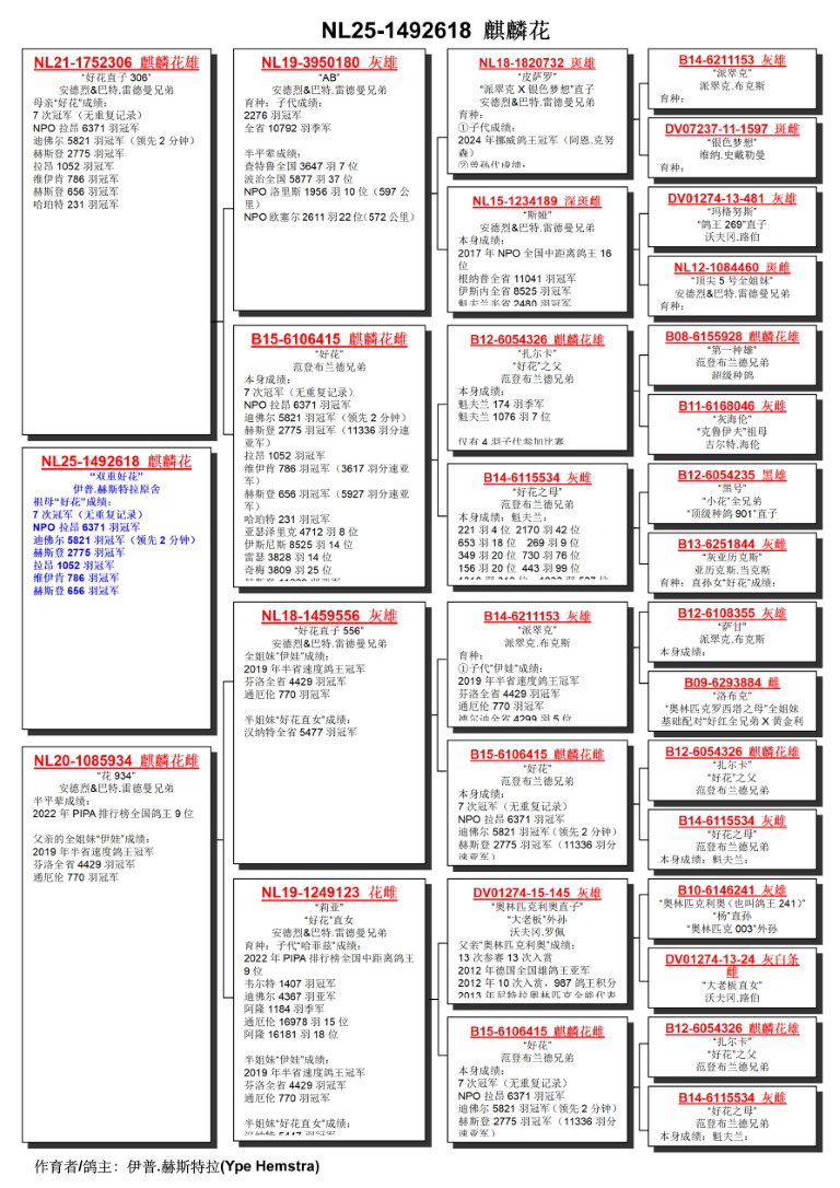 出自: ”好花儿子 306””好花”儿子, 7次冠军& 1位NPO 拉昂 6.371 羽 x ”花 934”, 出自 ”伊娃’兄弟,  NPO全国速度鸽王4位 & 1位省赛4.429 羽, 出自 ”好花”儿子和女儿, 7次冠军 & 1位NPO 拉昂6.371 羽