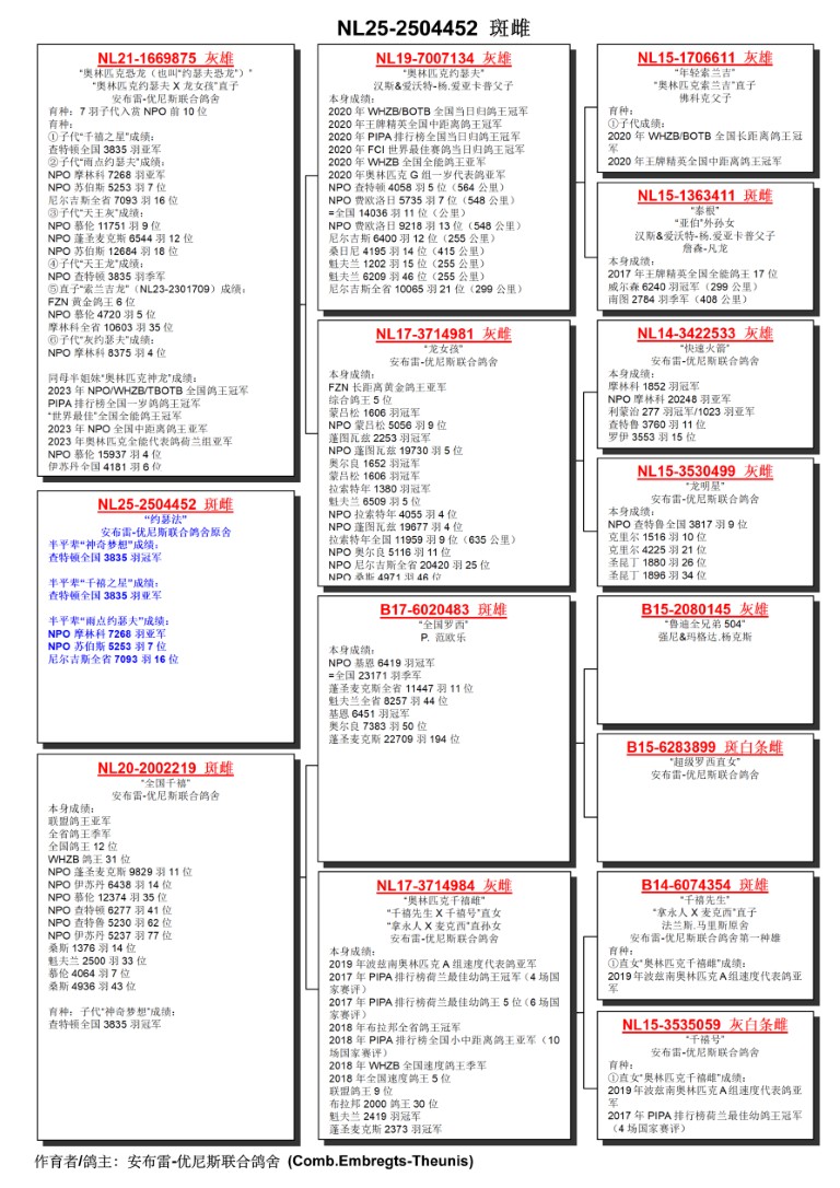 出自: ”约瑟夫恐龙”, 作出子代 2位NPO 7.268 羽, 2位全国 3.835 羽, 3位NPO 3.835 羽, 4位NPO 8.735 羽, 5位 NPO 4.720 羽, 7位NPO 7.093 羽, 9位 NPO 11.751 羽 x ”全国千禧”, 省赛鸽王3位, 全国鸽王12位, 作出子代 1位全国查特鲁3.835 羽