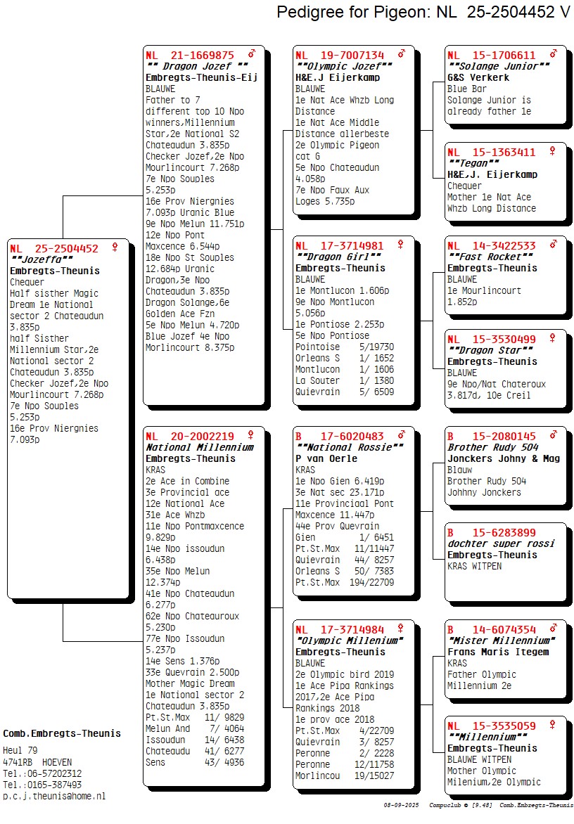 Uit: ”Dragon Jozef”, vader 2. NPO 7.268 d., 2. Nat. 3.835 d., 3. NPO 3.835 d., 4. NPO 8.735 d., 5. NPO 4.720 d., 7. NPO 7.093 d., 9. NPO 11.751 d. x ”National Millennium”, 3. Prov. Asduif, 12. Nat. Asduif, moeder 1. Nat. Chat. 3.835 d.