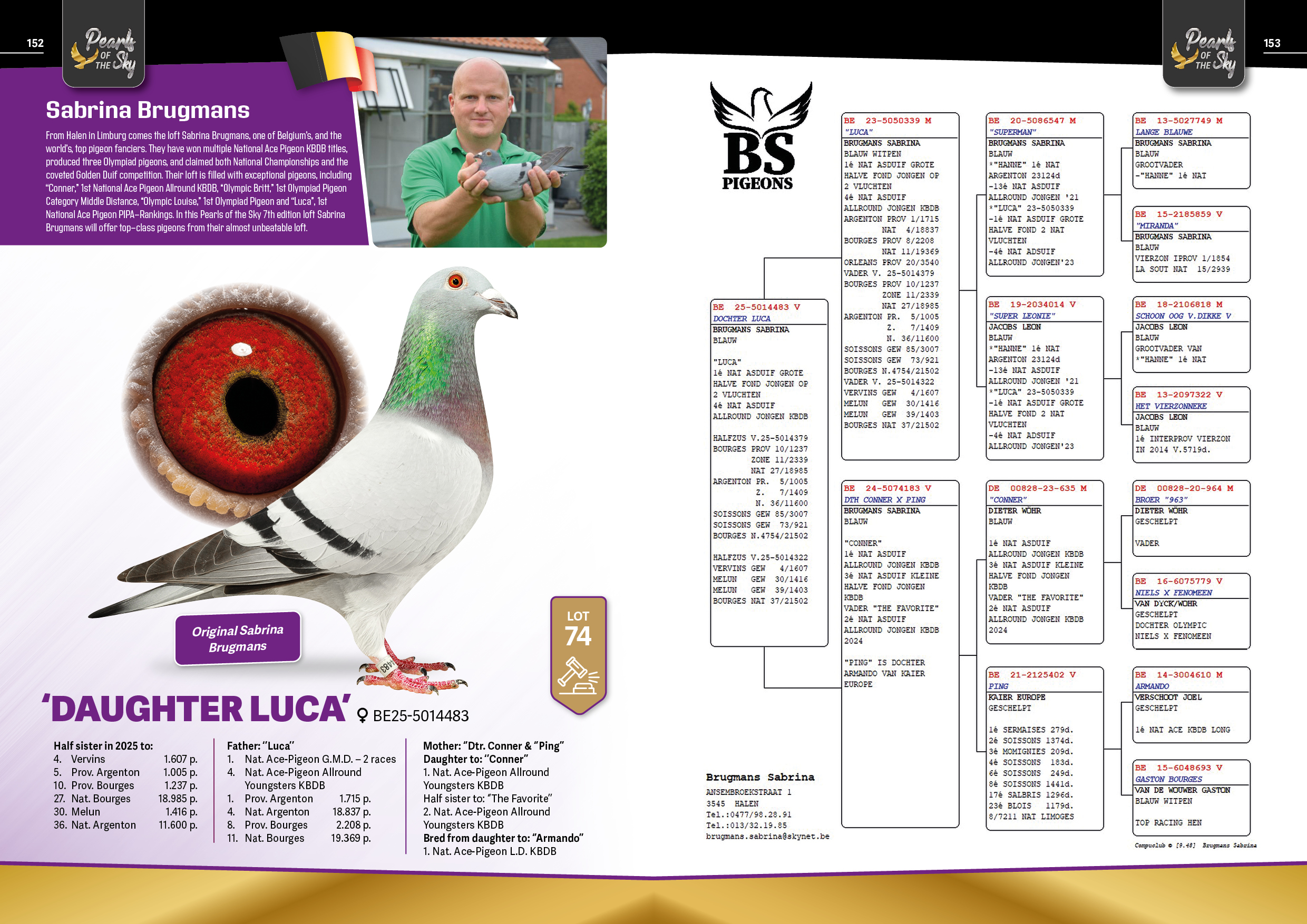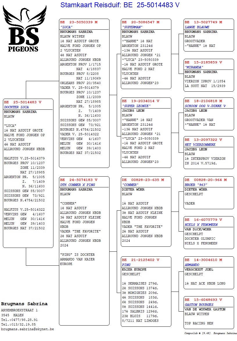 Uit: ”Luca”, 1. Nat. Asduif GHF 2 vluchten, 4. Nat. Asduif Jonge Allround KBDB, vader ”Lizzy”, 2. Nat. Asduif Jonge Allround KBDB 2025 x ”Dtr. Conner & Ping”, dochter ”Conner”, 1. Nat. Asduif KBDB, uit dtr. ”Armando”