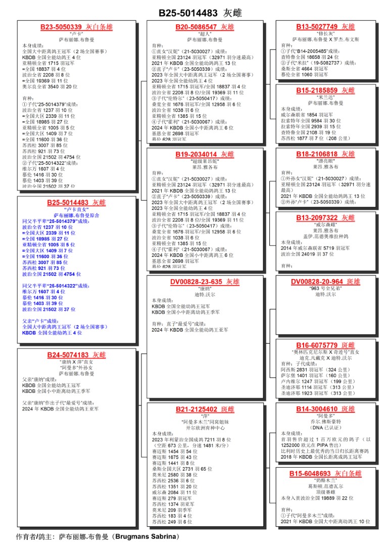 出自: ”卢卡”, 全国大中距离鸽王冠军(2场全国赛事), KBDB全国全能幼鸽王4位, 作出子代 ”利兹”, 2025年KBDB全国幼鸽全能鸽王亚军 x ”康纳X萍女儿”, 父亲 ”康纳”, KBDB全国鸽王冠军, 出自 ”阿曼多”女儿