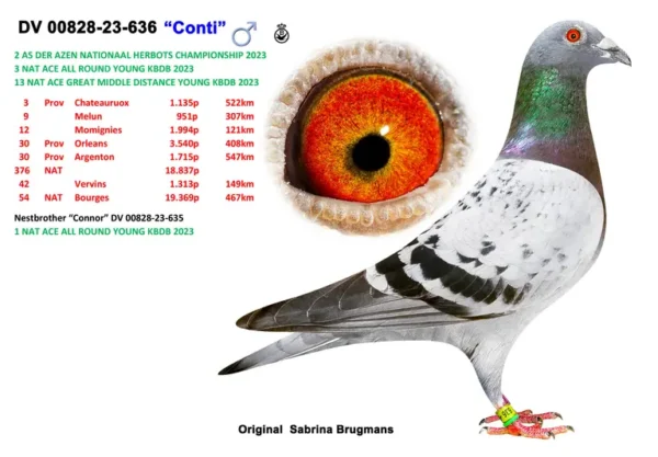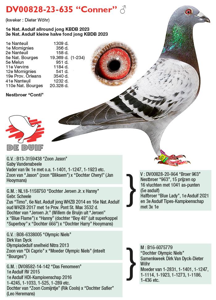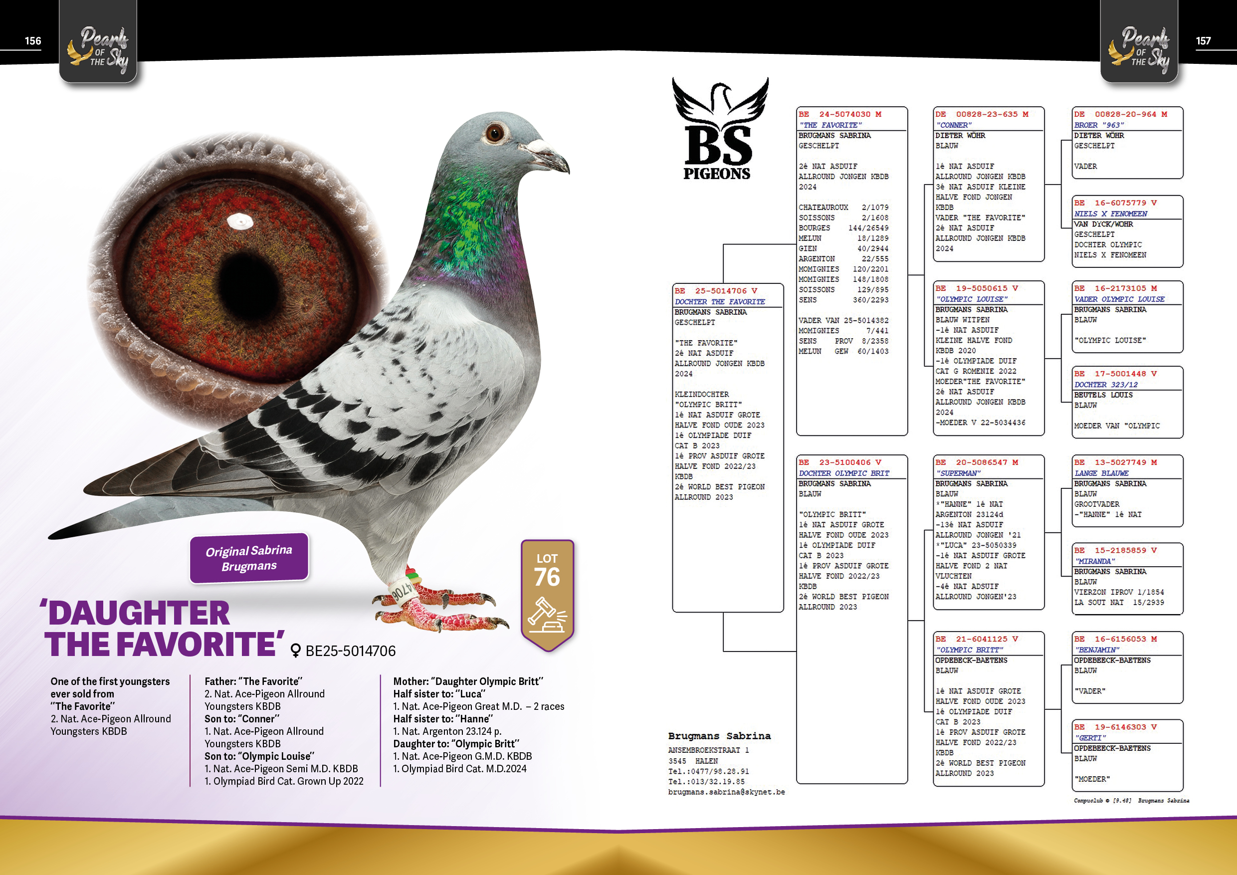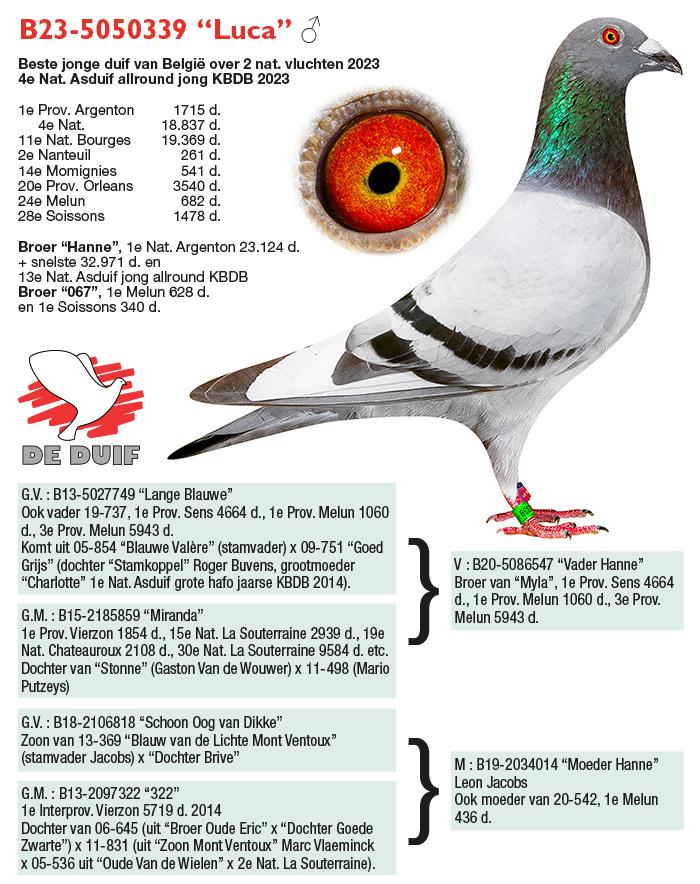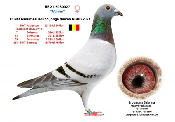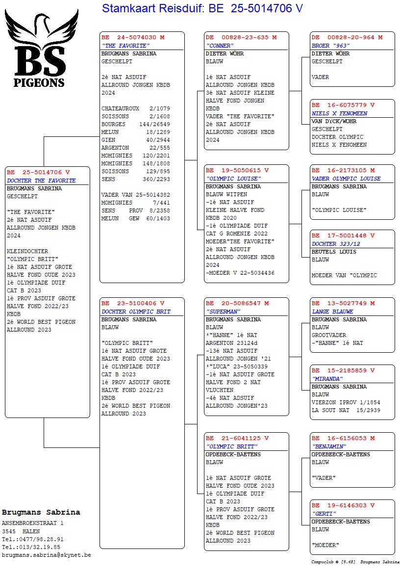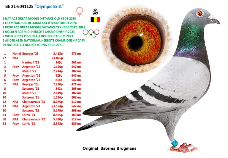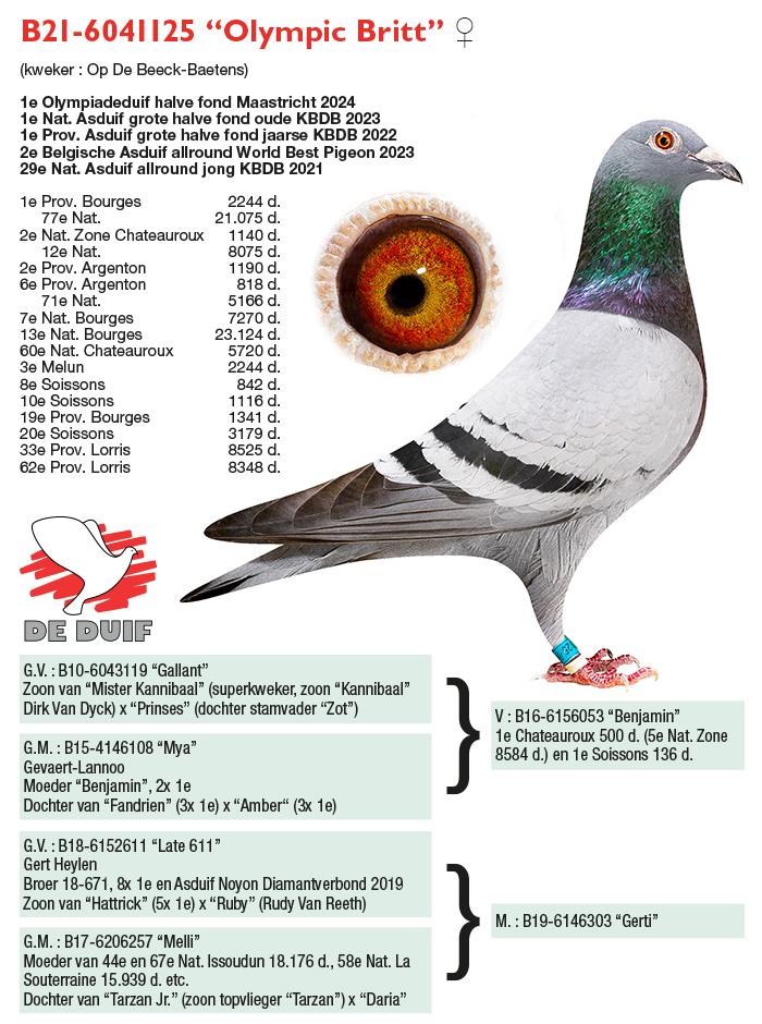 Uit: ”The Favorite”, 2. Nat. Asduif Allround Jonge KBDB, 2.-1.608 d., 2.-1.079 d., 18.-1.289 d., vader 8. Prov. Sens 2.358 d. x ”Dochter Olympic Britt”, dochter ”Olympic Britt”, 1. Nat. Asduif GHF KBDB, 1. Olympiade duif
