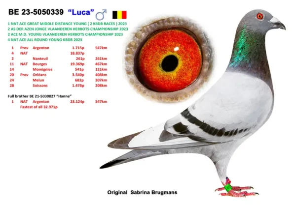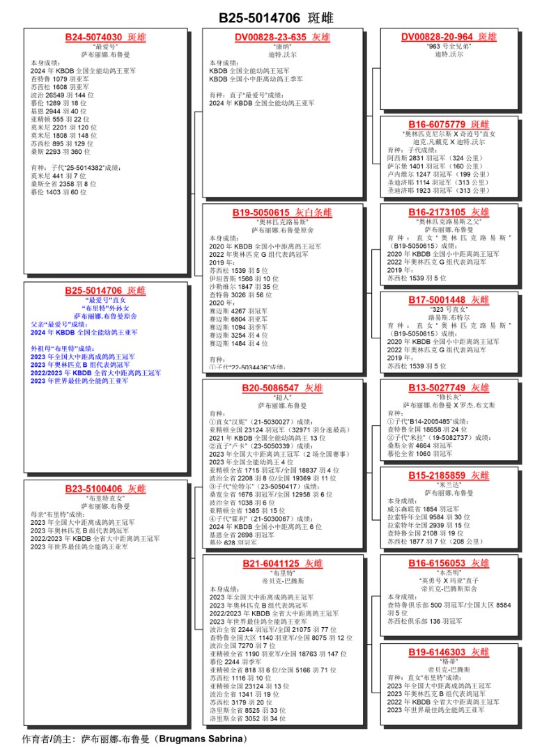 出自: ”最爱号”, BDB全国全能幼鸽王亚军, 2位-1.608 羽, 2位-1.079 羽, 18位-1.289 羽, 作出子代: 8位省赛桑斯 2.358 羽x ”布里特直女”, 母亲 ”奥林匹克布里特”, KBDB全国大中距离全国鸽王冠军, 奥林匹克冠军