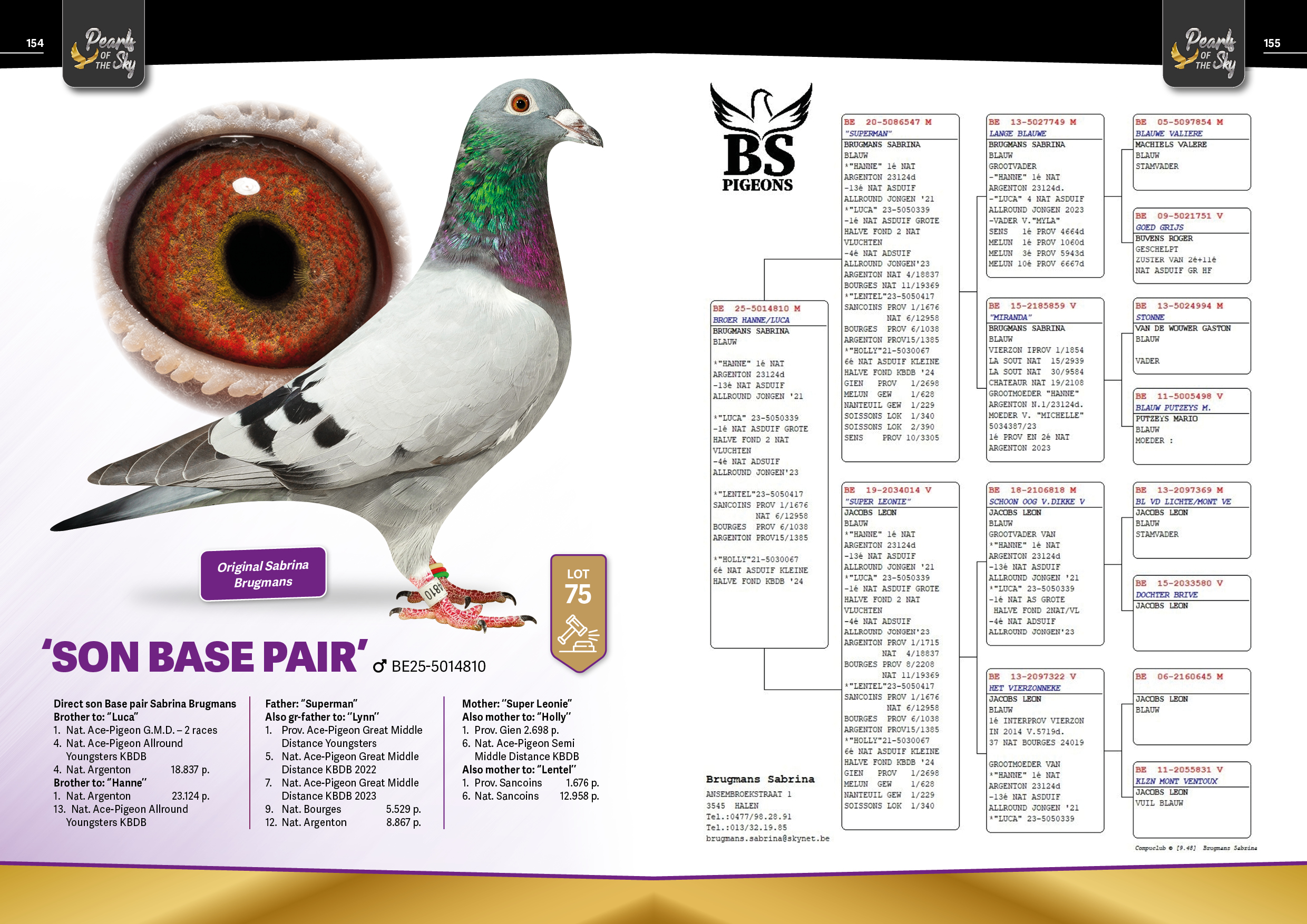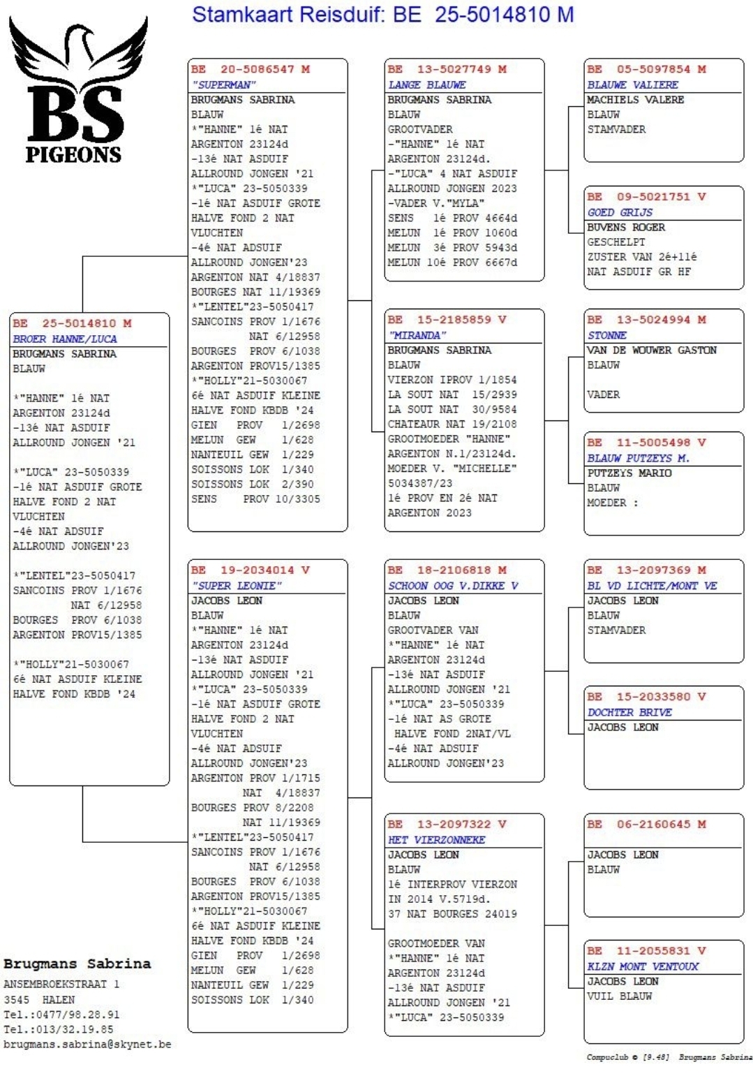 Uit: ”Superman” x ”Super Leonie”, ouders: 1. Nat. Asduif GHF 2 vluchten, 1. Nat. Argenton 32.975 d., 1. Prov. 2.698 d., 1. Prov. 1.676 d., 4. & 6. Nat. Asduif KBDB, gr-ouders: 2.-5.-7. Nat. Asduif KBDB, 1. Prov. Asduif, 1. Prov. 796 d.