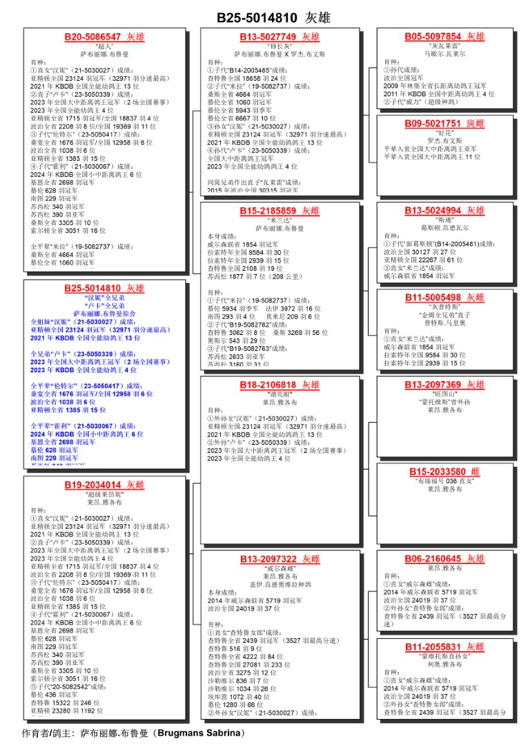 出自: ”超人” x ”超级莱昂妮”,配对作出子代: 全国大中距离鸽王冠军(2场全国赛事), 1位全国亚精顿 32.975 羽, 1位省赛2.698 羽, 1位省赛 1.676 羽, KBDB全国鸽王4位&6位, 作出孙代: KBDB全国鸽王2位-5位-7位, 省赛鸽王冠军, 1位省赛796 羽
