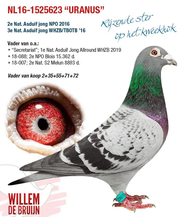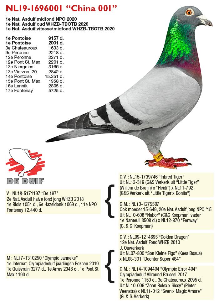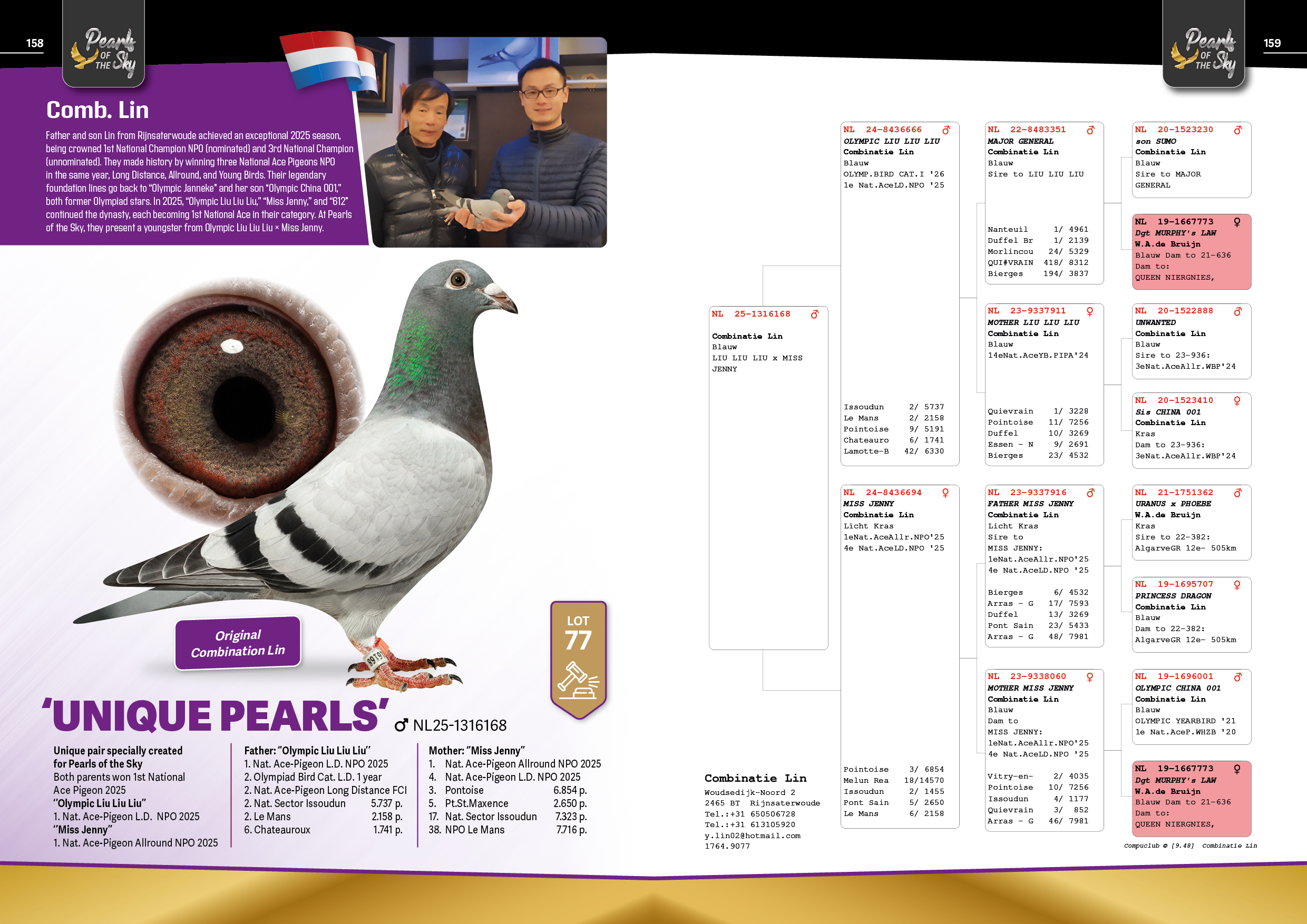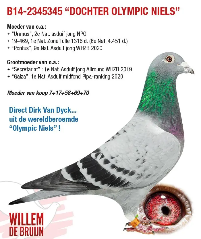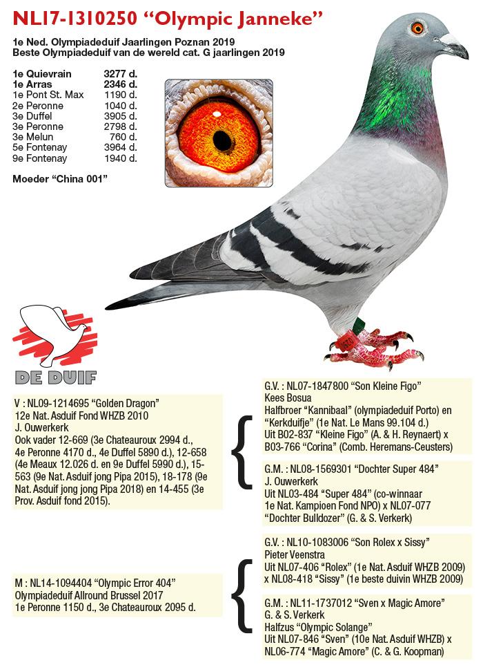 Uit: ”Olympic Liu Liu Liu”, 1. Nat. Asduif Dagfond NPO 2025, 2. Olympiade duif Cat. Fond 1 jaar 2026, 2.-5.737 d., 2.-2.158 d. x ”Miss Jenny”, 1. Nat. Asduif Allround NPO 2025, 4. Nat. Asduif Dagfond NPO 2025, 2.-1.455 d., 3.-6.854
