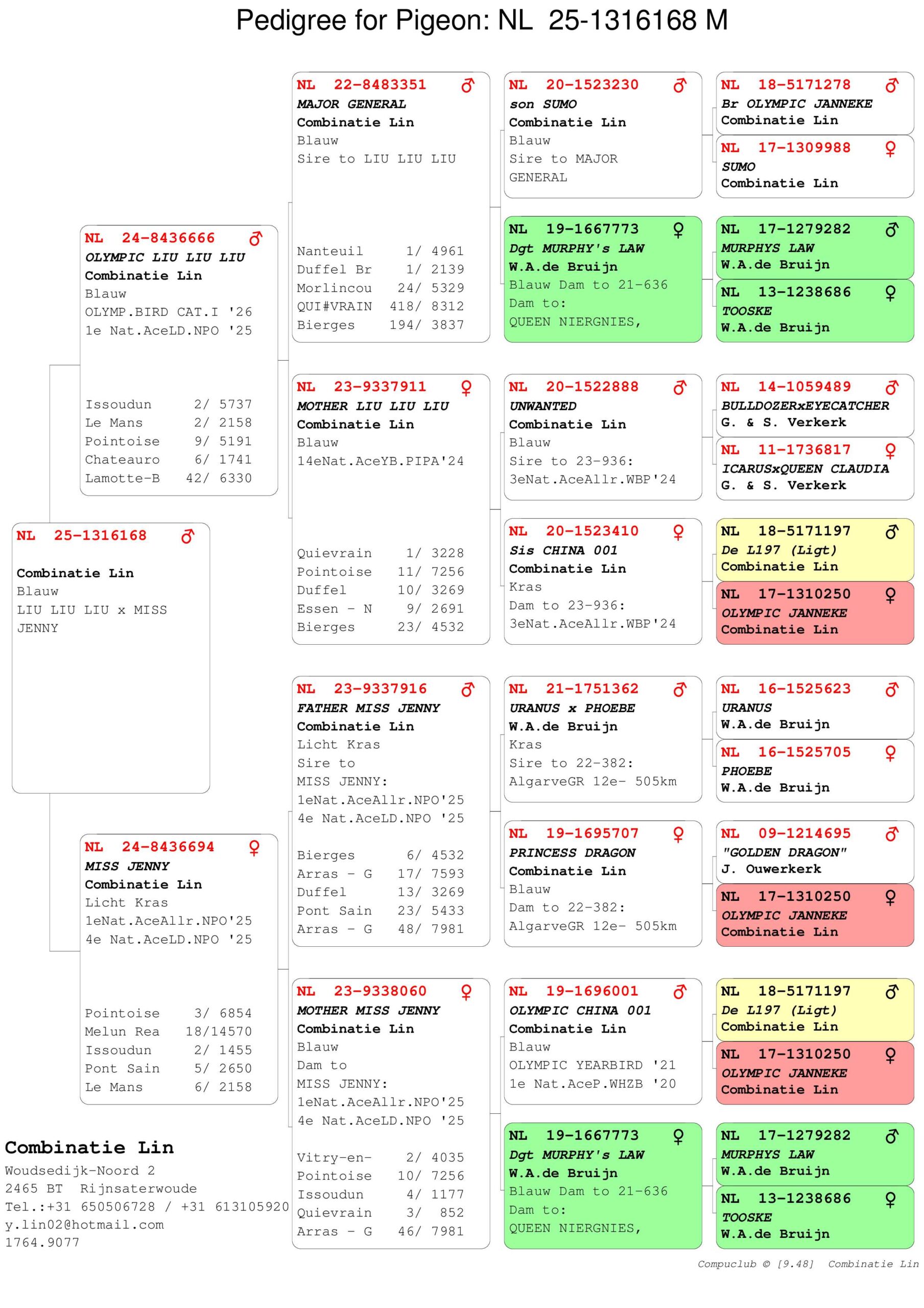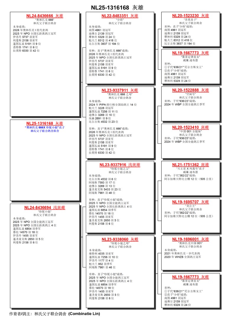 出自: ”奥林匹克666”, 2025年NPO全国当日归长距离鸽王冠军, 2026年奥林匹克长距离亚军, 2位-5.737 羽, 2位-2.158 羽 x ”珍妮小姐”, 2025年NPO全国全能鸽王冠军, 2025年NPO全国当日归长距离鸽王4位, 2位-1.455 羽, 3位-6.854羽