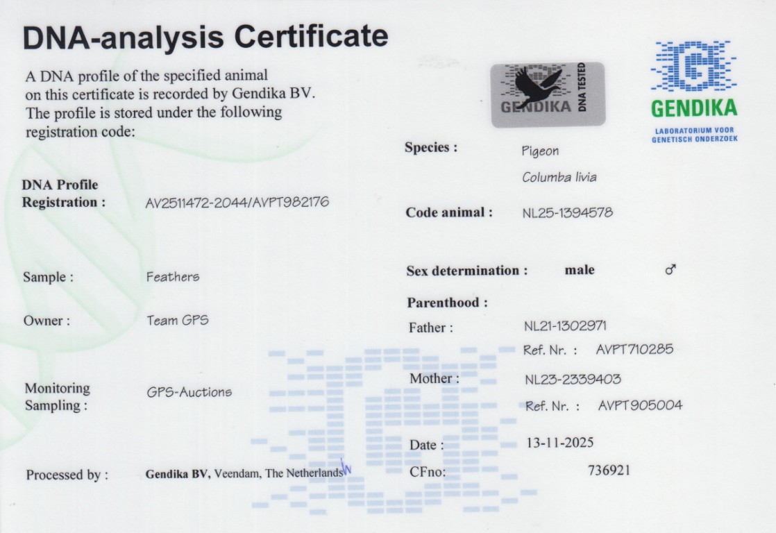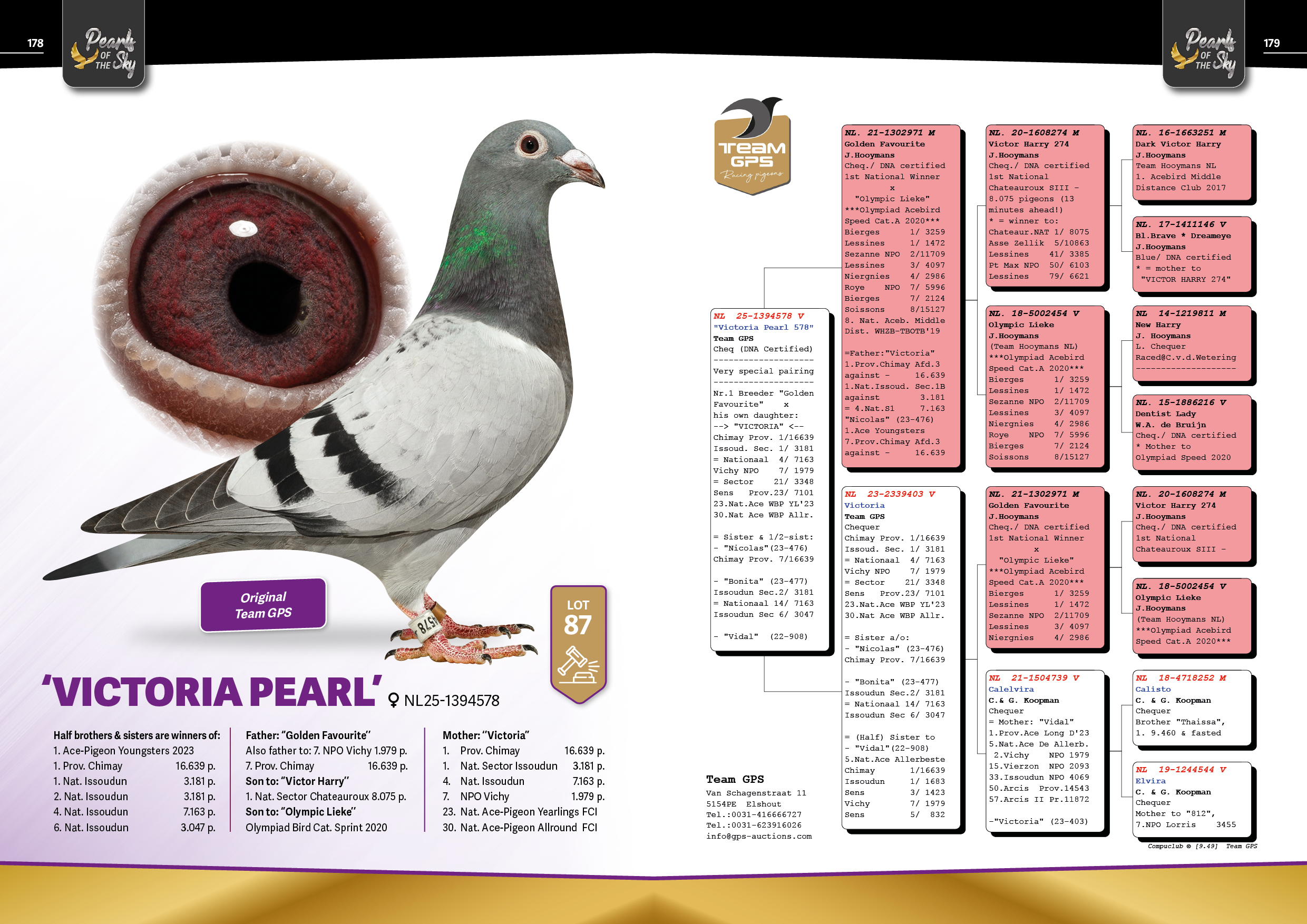 Uit: ”Golden Favourite”, vader 1. Prov. 16.639 d., 1. Nat. 3.181 d., 2. Nat. 3.181 d., 4. Nat. 7.163 d., 6. Nat. 3.047 d., 6. NPO 1.842 d., 7. Prov. 16.639 d. x ”Victoria”, 1. Prov. Chimay 16.639 d., 1. Nat. Issoudun 3.181 d., 7. NPO Vichy 1.979 d.