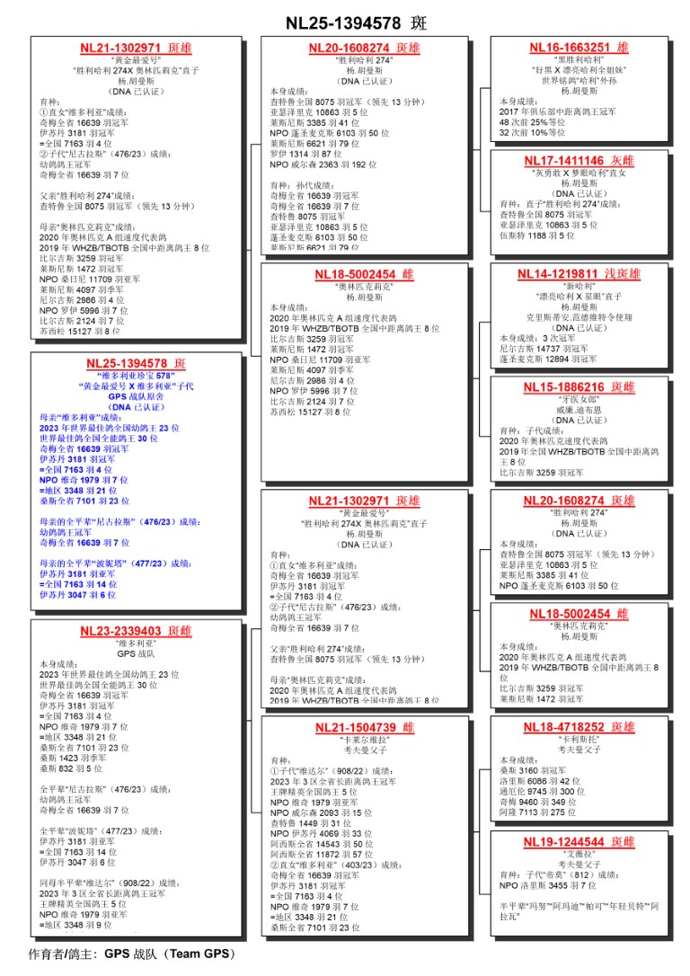 出自: ”黄金最爱号”, 作出子代 1位省赛16.639羽, 1位全国 3.181 羽, 2位全国 3.181 羽, 4位全国 7.163 羽, 6位全国3.047羽, 6位NPO 1.842 羽, 7位省赛16.639 羽 x ”维多利亚”, 1位省赛奇梅 16.639 羽, 1位全国 伊苏顿3.181 羽, 7位NPO 维奇1.979 羽