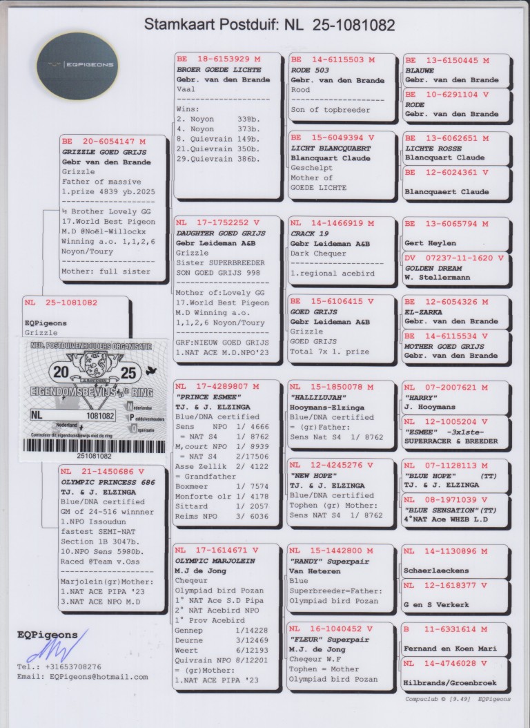 Uit: ”Grizzle Goed Grijs”, vader 1.-4.839 d., uit dochter ”Goed Grijs”, nazaten winnen: 7x 1. Nat. Asduif x ”Olympic Princess 686”, gr-moeder 1. Nat. Issoudun 3.047 d., dochter ”Prince Esmee” & ”Olympic Marjolein”