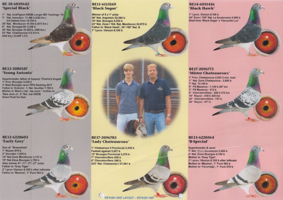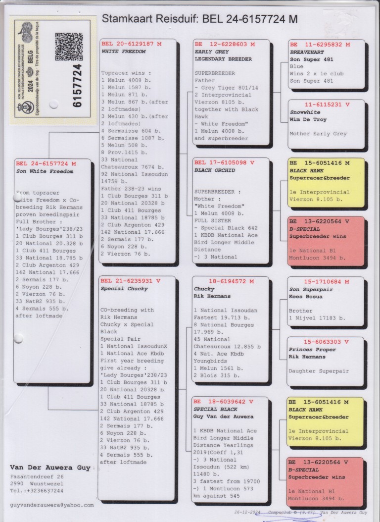 Uit: ”White Freedom”, 1.-4008 d., 1.-1.587 d., 1.-871 d., 3.-867 d., 3.-430 d., 4.-604 d., 33. Nat. Chateauroux 7.674 d. x ”Special Chucky”, dochter ”Chucky”, 1. Nat. Issoudun 19.713 d., dochter ”Special Black”, 1. Nat. Asduif KBDB
