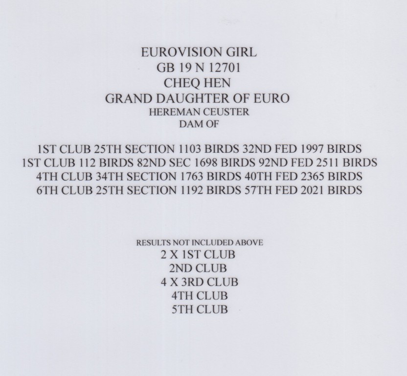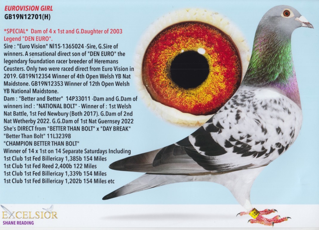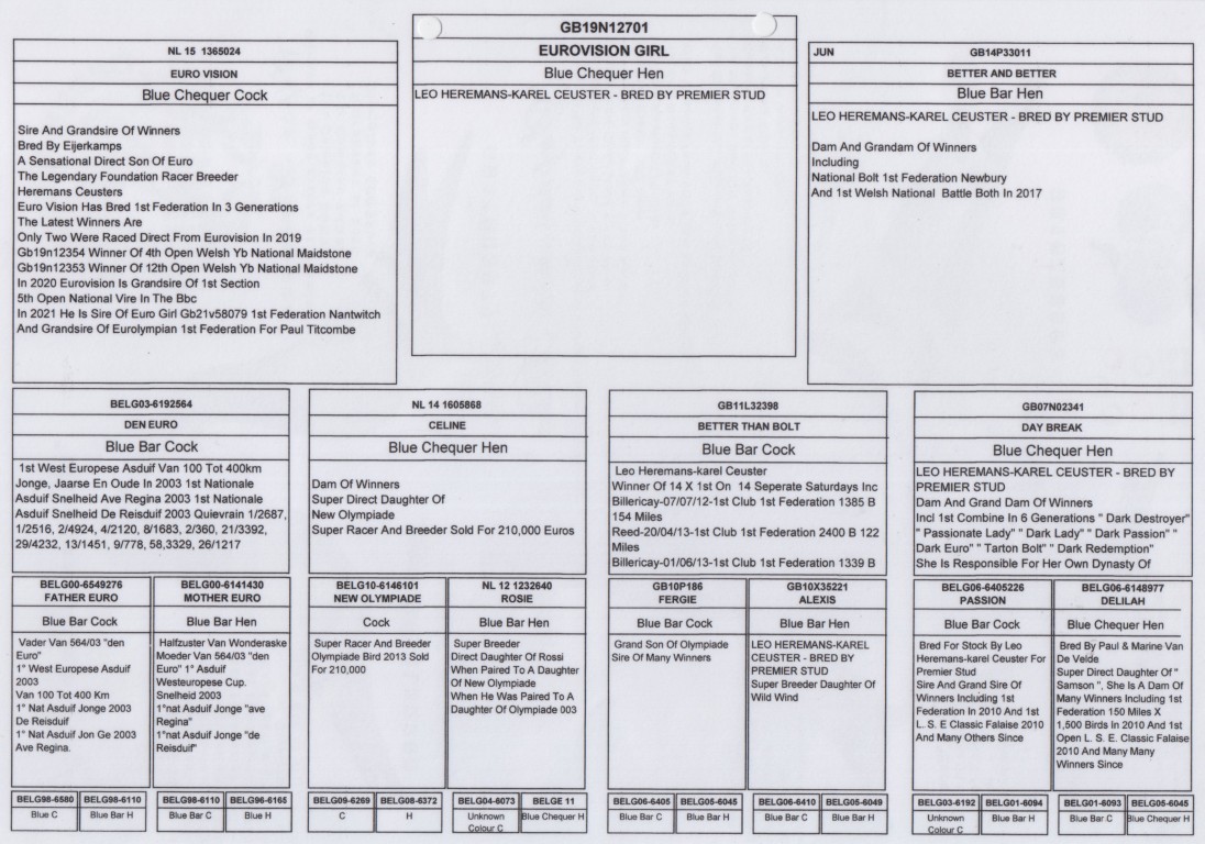 Uit: ”Euro Vision”, Superkweker & zoon ”Den Euro”, 1. Wencup Dortmund, 1. Nat. Asduif Sprint & legendarische kweker x ”Better and Better”, (Gr) moeder ”National Bolt”, 1. Federatie Newbury, 1. Welsh National Battle 2017