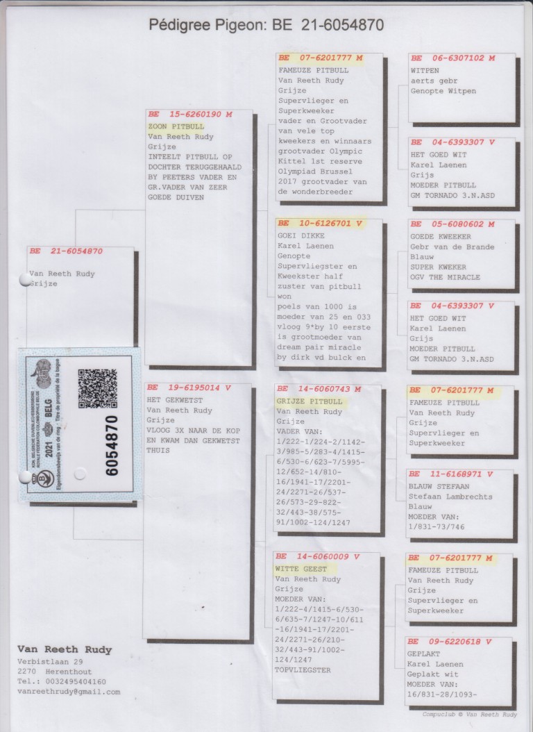 Uit: ”Zoon Pitbull”, vader & gr-vader van zeer goede duiven, zoon ”Pitbull”, nazaten winnen 4x 1. Nat. Asduif & Olympiade duif x ”Het Gekwetst”, uit zoon & dochter ”Pitbull”, nazaten winnen 4x 1. Nat. Asduif