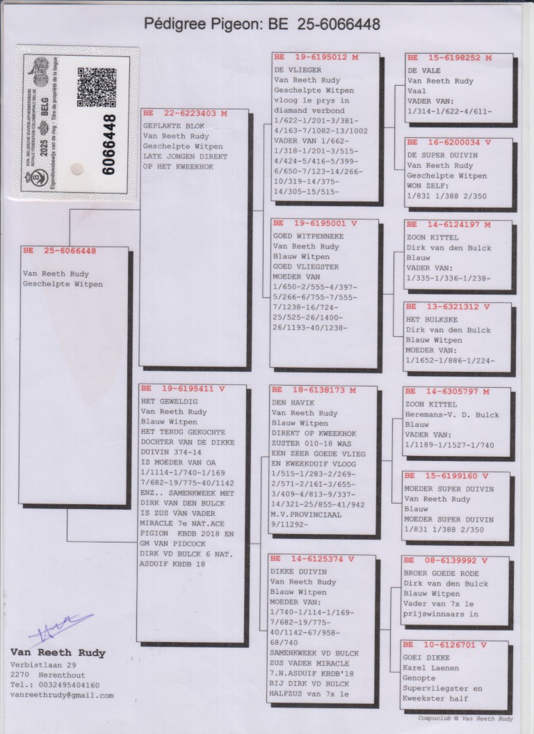 Grootmoeder: BE14-6125374. ‘’Dikke Duivin’’, Rudy van Reeth.