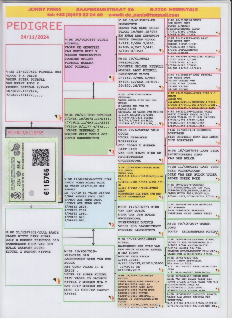Vader ‘De Gekwetste’ van Rudy van Reeth x Moeder ‘Sneeuwwitje’, dochter ‘Grijze Pitbull’, moeder ‘Lady Pitbull’.