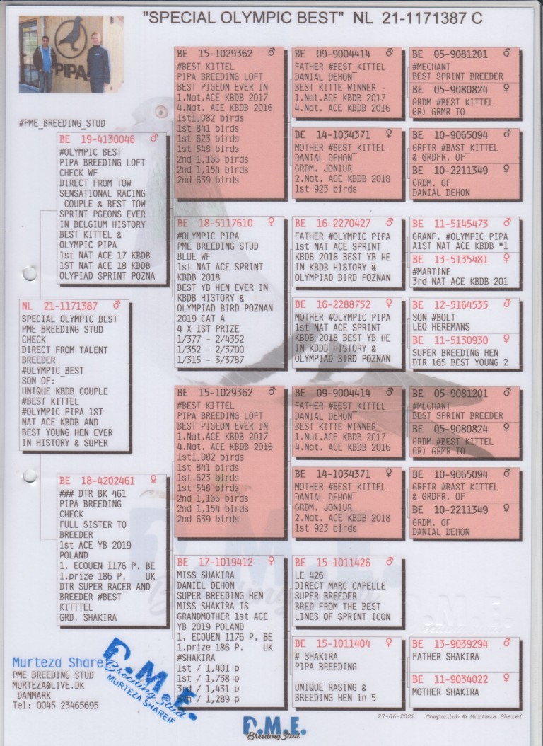 Uit: ”Olympic Best”, zoon ”Best Kittel”, 1. & 4. Nat. Asduif Sprint KBDB, zoon ”Olympic PIPA”, 1. Nat. Asduif Sprint KBDB x ”Dtr. Best Kittel”, dochter ”Best Kittel”, 1. & 4. Nat. Asduif Sprint KBDB & Stamvader PIPA Breeding
