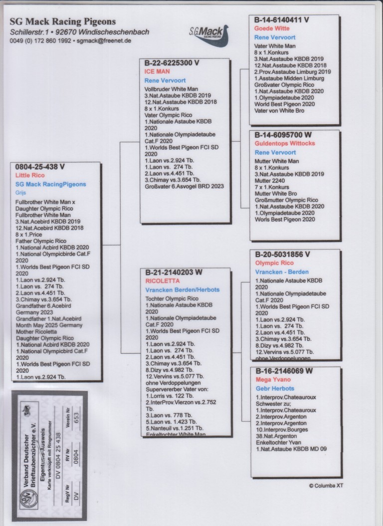 Uit: ”Ice Man”, broer ”White Man”, 3. & 12. Nat. Asduif Sprint KBDB, vader ”Olympic Rico” x ”Ricoletta”, dochter ”Olympic Rico”, 1. Nat. Asduif Sprint KBDB, 1. Int. Asduif Jonge Duiven FCI, 1. Olympiade duif Cat. Jonge Duiven
