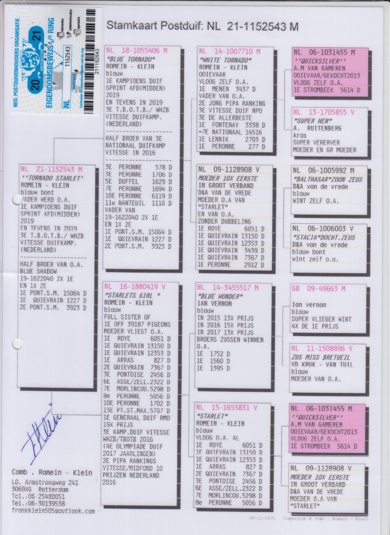 Uit: “Blue Tornado”, 1. Prov. Asduif, 3. Nat. Asduif WHZB, 3.-578d., 3.-1.706d., 5.-1.629d., 10-6.119d., zoon “White Tornado”, 1.-3.437d. & “The 908”, moeder 10x 1. x “Starlet Girl”, zus 1.-39.187d., dochter “Blue Wonder” & “Starlet”, 1.-13.150d., 1.-12.353d. !!!!!!!!!!!!!!!!