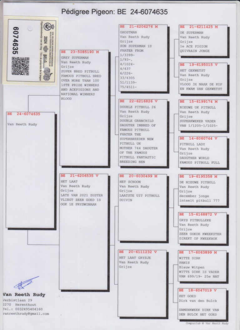 Uit: ”Grey Superman”, inteelt ”Pitbull”, nazaten winnen: 1.-1.-1.-1.-2.-2.-2.-2.-3.-3.-3.-3.-4. Nat. Asduif & Olympiade duif x ”Het Laat”, zus 1. Prijs Winnaar, inteelt ”Pitbull”, legendarische vlieger en kweker