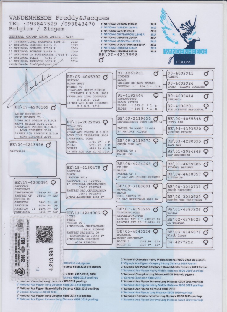 Uit: ”De 169”, 1/2 broer 1. Nat. Asduif GHF KBDB, 6. Nat. Asduif Fond KBDB, zoon stamvader ”Mattheo” x ”Keppetje”, 1. Snelste Nat. Chateauroux 25.543 d., moeder 6.-1.494 d., 8.-7.481 d., 9.-4.054 d.
