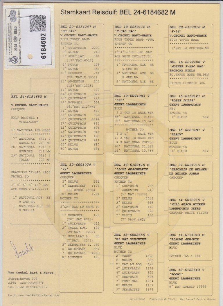 Uit: ”HH 247”, vader 1.-2.207 d., 3.-248 d., 5.-161 d., 6.-238 d., 7.-343 d. x ”79”, 2.-885 d., 9.-1.179 d., 10.-1.291 d., moeder 5. Nat. Asduif Fond KBDB Jaarlingen, 1.-455 d., 1.-129 d., 2.-109 d., 3.-750 d., 5.-637 d., 7.-1.263 d.