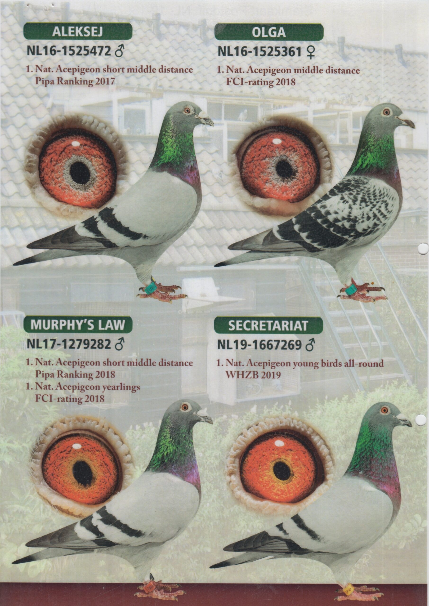 Zus ”De 511”, 1. Nat. Asduif Issoudun 2020/2021 België, uit: ”Aleksej”, 1. Nat. Asduif Vitesse / Midfond PIPA, 2. Nat. Asduif Vitesse x ”Olga”, 1. Nat. Asduif Midfond FCI, 3. Nat. Asduif Jaarlingen PIPA & 6x top 7 Nat. Asduif