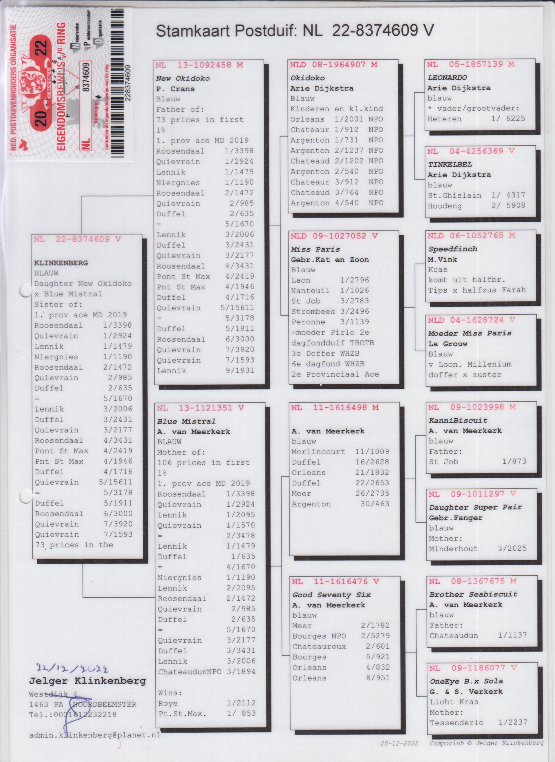 (1/2) zus 1. Prov. Asduif Midfond, 1.-3.398 d., 1.-2.924 d., 1.-2.095 d., 1.-1.570 d., 1.-1.479 d., 1.-1.190 d., 2.-2.095 d., 2.-1.472 d., 3.-2.431 d., 3.-2.177 d., 3.-2.006 d., 4.-3.431 d., etc. uit: ”New Okidoko” x ”Blue Mistral”