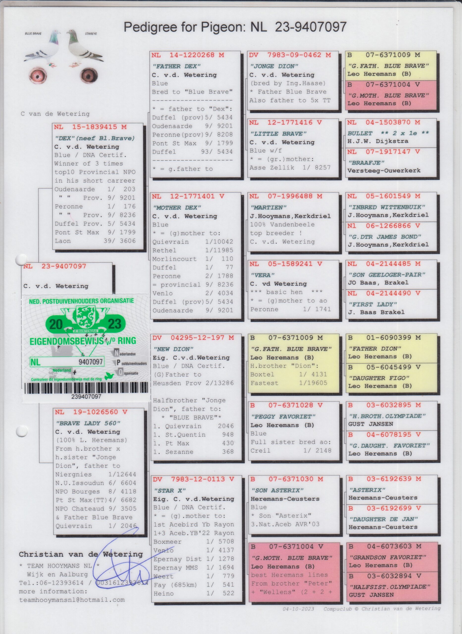 Uit: ”Dex”, 1.-203 d., 1.-176 d., 5. Prov. 5.434 d., 9. Prov. 9.201 d., 9. Prov. 8.236 d., 9.-1.799 d. x ”Brave Lady 560”, 1/2 zus ”Jonge Dion”, vader 1.-12.644 d. & vader ”Blue Brave”, gr-vader ”Corrie”, ”Olympic Jan” & ”Olympic Suze”