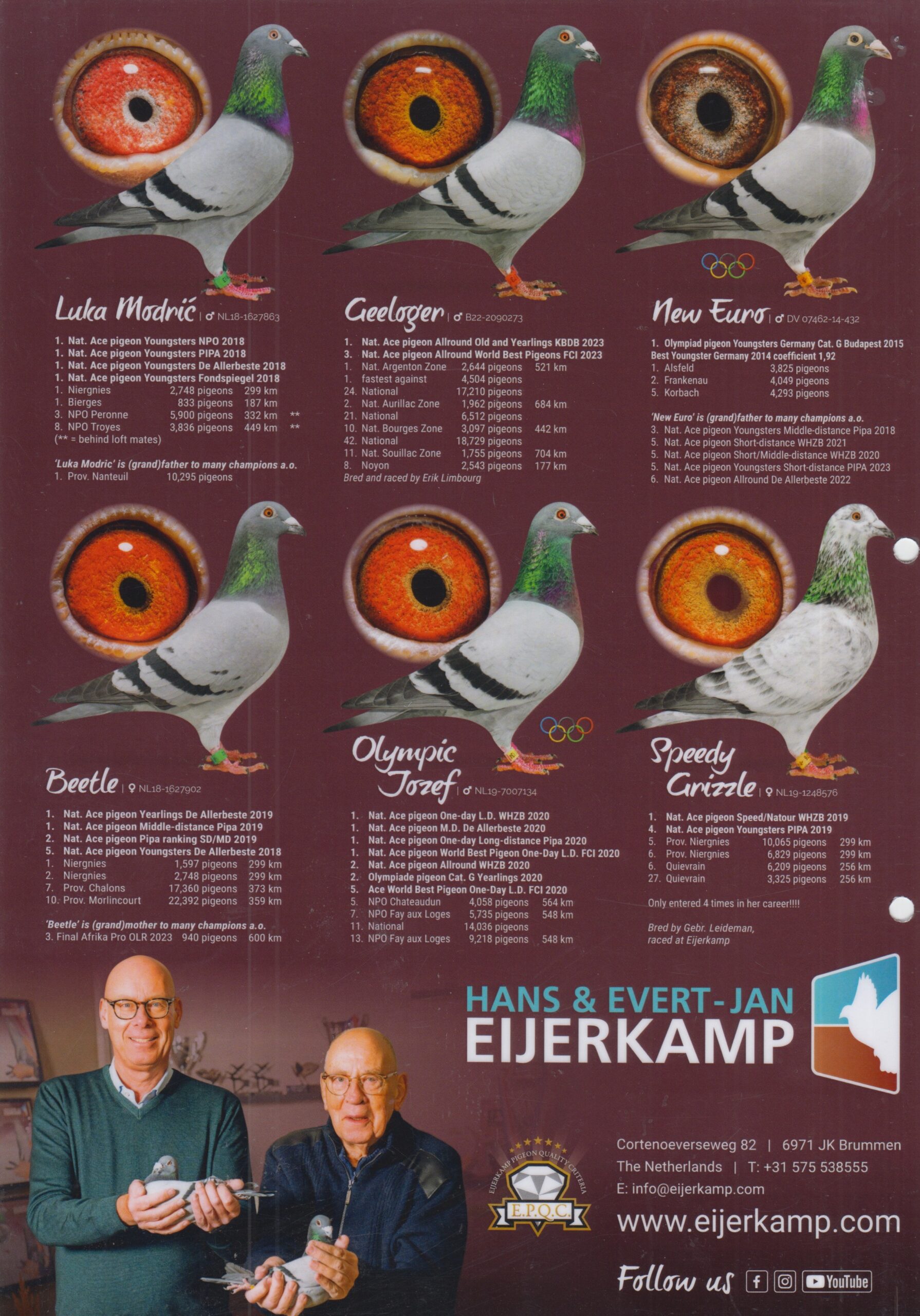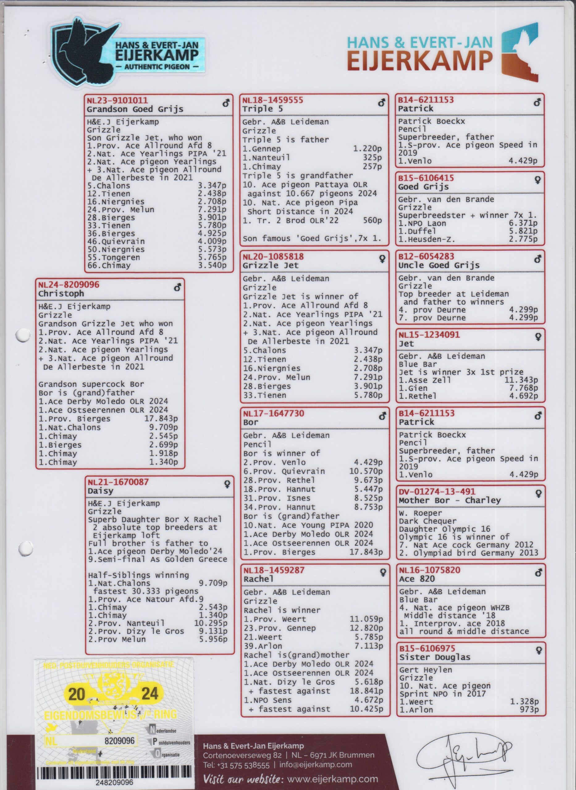 Uit: ”Grandson Goed Grijs”, uit zoon ”Goed Grijs”, 7x 1. Prijs & 1. NPO Laon 6.371 d., zoon ”Grizzle Jet”, 1. Prov. Asduif Allround x ”Daisy”, dochter ”Bor”, Superkweker, dochter ”Rachel”, 1. Prov. Weert 11.059 d.