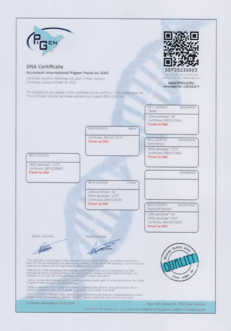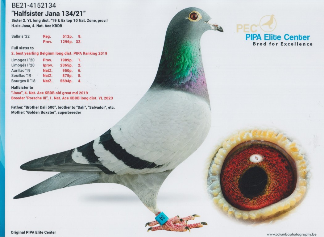 Uit: ”Brother Dali”, vader 1.-6.876 d., 1.-1.989 d., 2. Nat. Asduif x ”Golden Boxster”, gr-moeder 1. Nat. Asduif KBDB, moeder 1.-1.989 d., 1.-1.285 d., 2x 2. Nat. Asduif, 4. Nat. Asduif KBDB