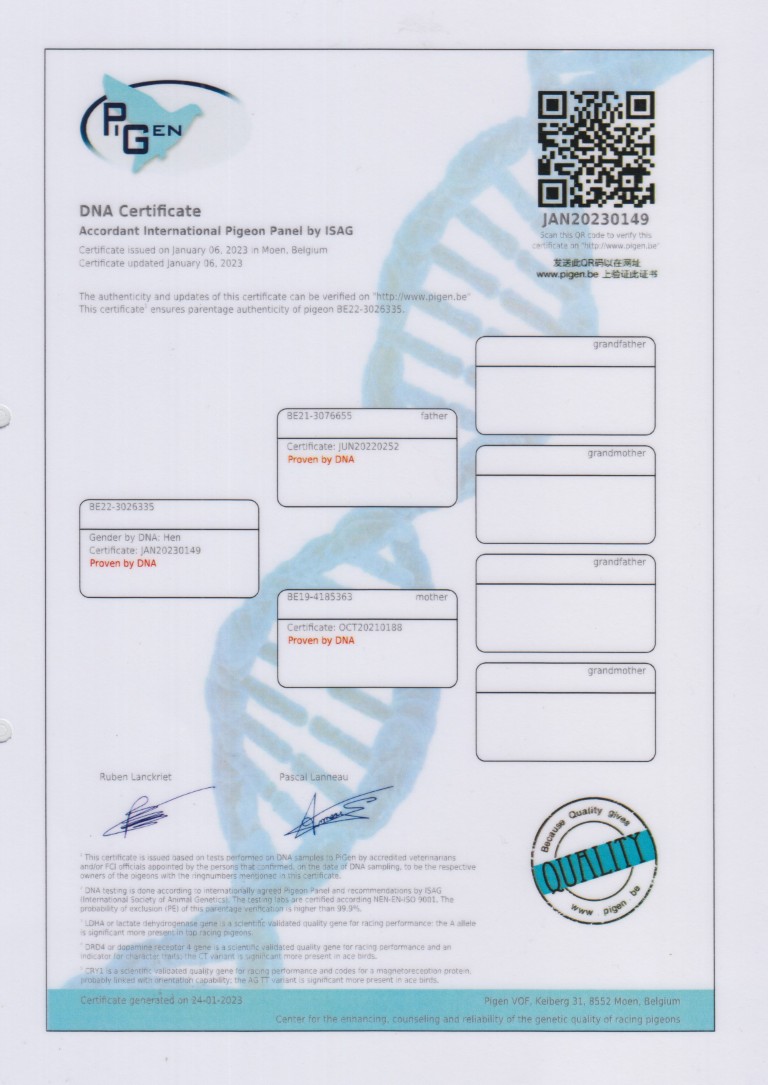 Uit: ”Guiseppe”, 1. Nat. Asduif KHF KBDB, 1. Prov. Asduif KHF KBDB x ”Evelyne PEC”, moeder 30. Nat. Asduif KBDB, dochter ”Porsche 911”, 5. Nat. Asduif KBDB & PEC Superkweker