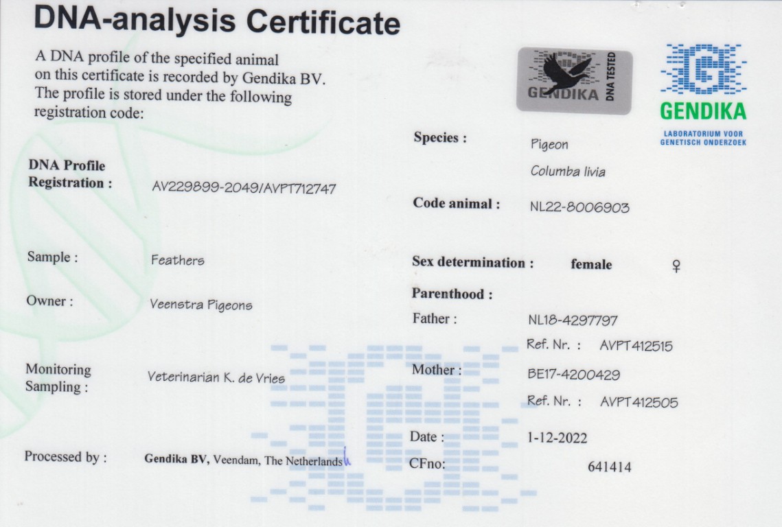 Zij komt uit NL04-5435151. “Davinci”. 1. NPO. P. Veenstra. DNA gecertificeerd.