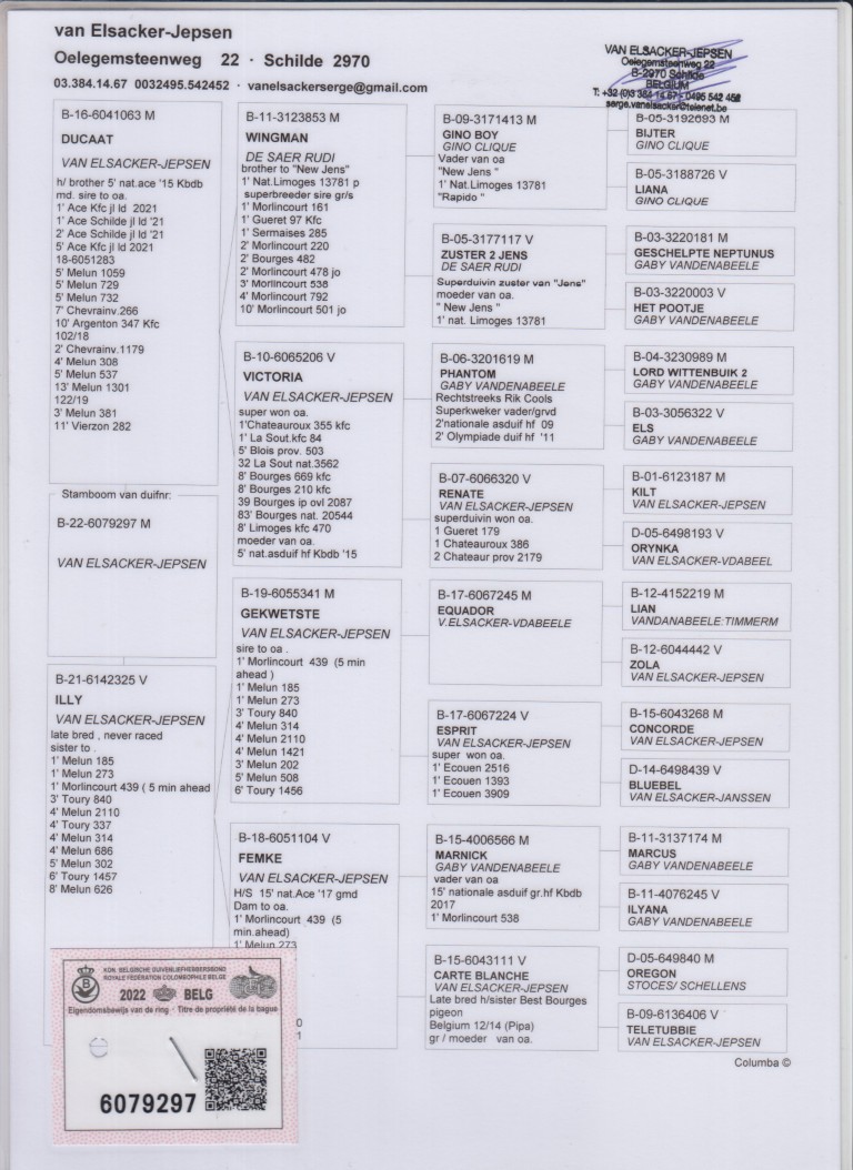 Uit: ”Ducaat”, vader 2. Chevr. 1.179 d., 3. Melun 381 d., 4. Melun 308 d., 5. Melun 1.059 d., etc., uit broer ”New Jens”, 1. Nat. Limoges 13.781 d. x ”Illy”, zus 1. Morlincourt 439 d. ( 5 min. vooruit), 1. Melun 273 d.