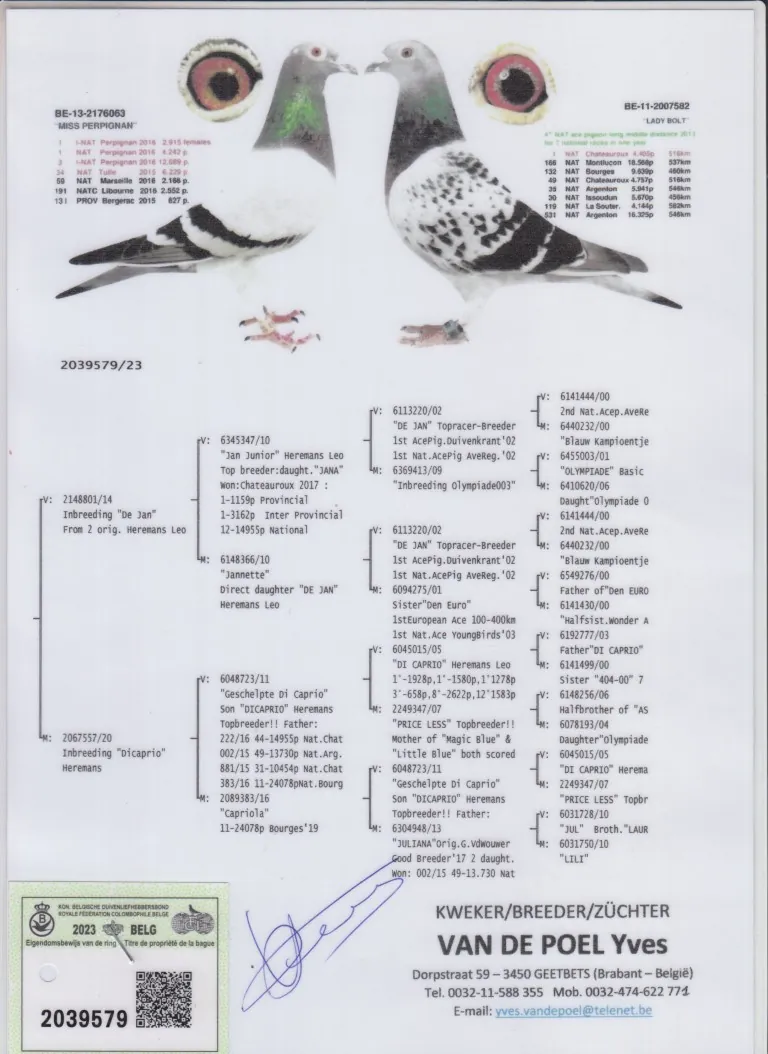Uit: ”Inbreeding Jan”, zoon ”Jan Junior”, vader ”Jana”, 1. Inter-Prov. Chateauroux 3.162 d., uit zoon & dochter ”De Jan”, 1. Nat. Asduif bij Leo Heremans x ”Inbreeding Di Caprio”, inteelt ”Di Caprio”, Dirk van Dyck
