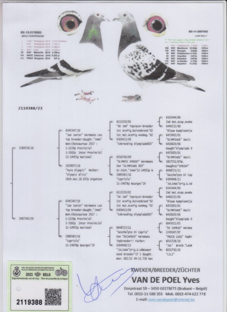Uit: ”Zoon Jan Junior”, zoon ”Jan Junior”, vader ”Jana”, 1. Inter-Prov. Chateauroux 3.162 d., 12. Nat. Chateauroux 14.955 d. x ”Dochter Jan Junior”, uit zoon ”De Jan”, 1. Nat. Asduif bij Le0 Heremans
