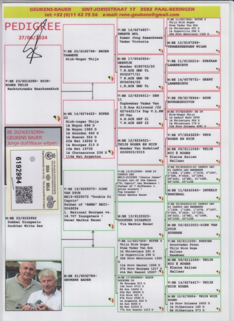 Uit: ”Nick & Roger Thys 288”, zoon ”Super 22”, 5x 1. Prijs, 16. Nat. Bourges 19.736 d., 22. Nat. Gueret 16.292 d. x ”Dobbel Di Caprio”, uit dubbele klz. ”Di Caprio”, Dirk van Dyck, uit dochter ”Witte 6”, stamvader Thys