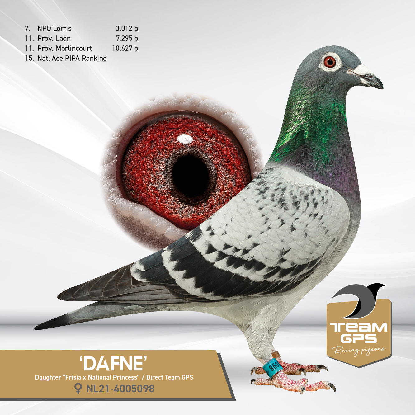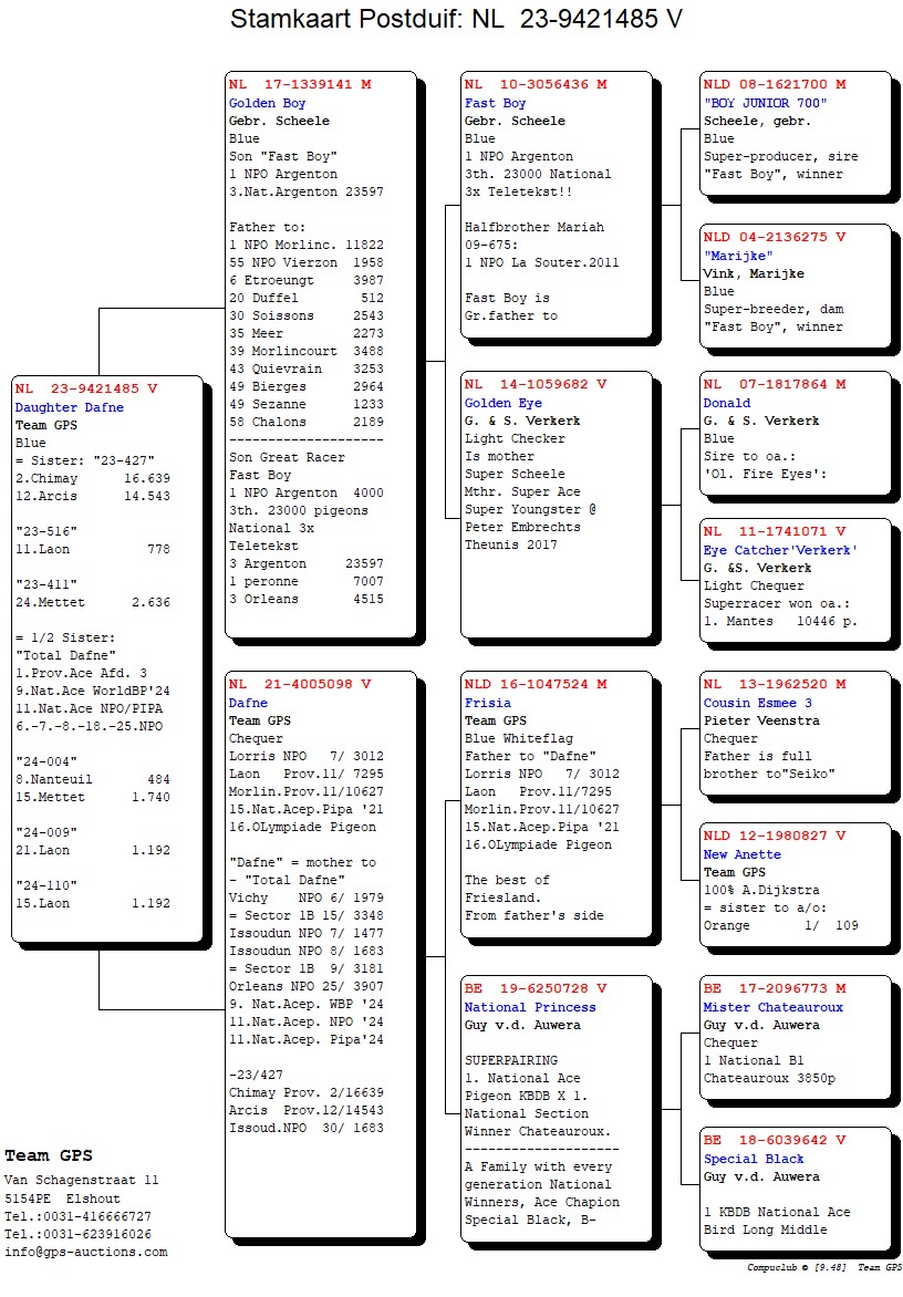 “Dgt. Dafne”, uit “Golden Boy”, vader 1. NPO Morlincourt 11.822 d. x “Dafne”, 7. NPO 3.012 d., 9. Prov. 3.841 d., 11. Prov. 10.627 d., 15. Nat. Asduif.