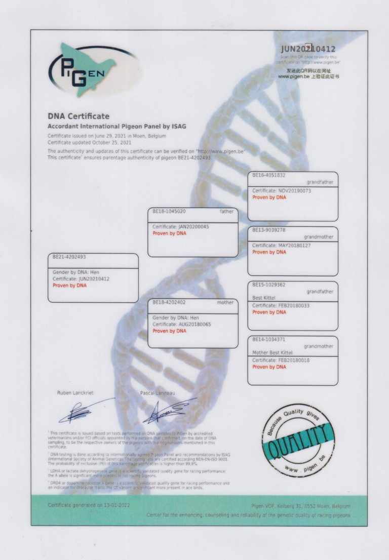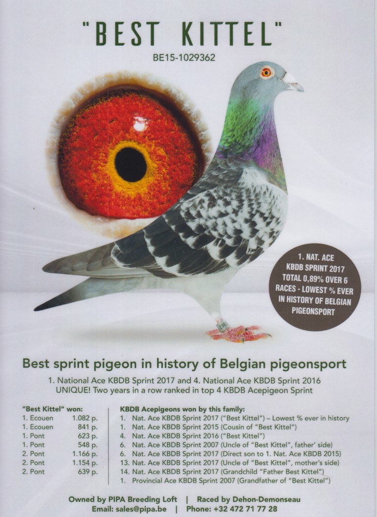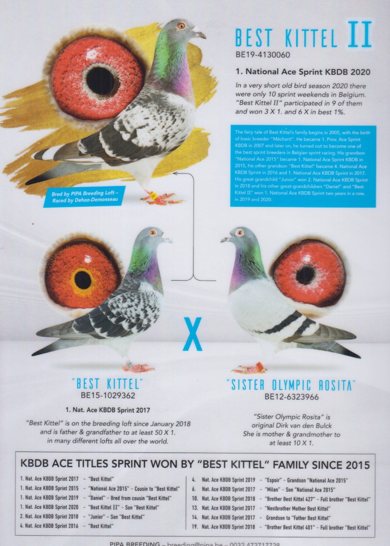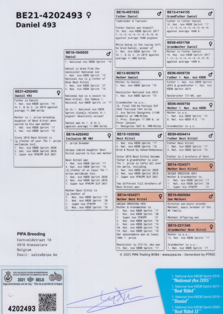 Uit: ”Daniël”, 1. Nat. Asduif Sprint KBDB 2019 x ”Exclusive BK 402”, dochter & 1/2 zus ”Best Kittel”, 1. & 4. Nat. Asduif Sprint KBDB, vader 1. & 2. Nat. Asduif Sprint KBDB, unieke stamvader PIPA Breeding.