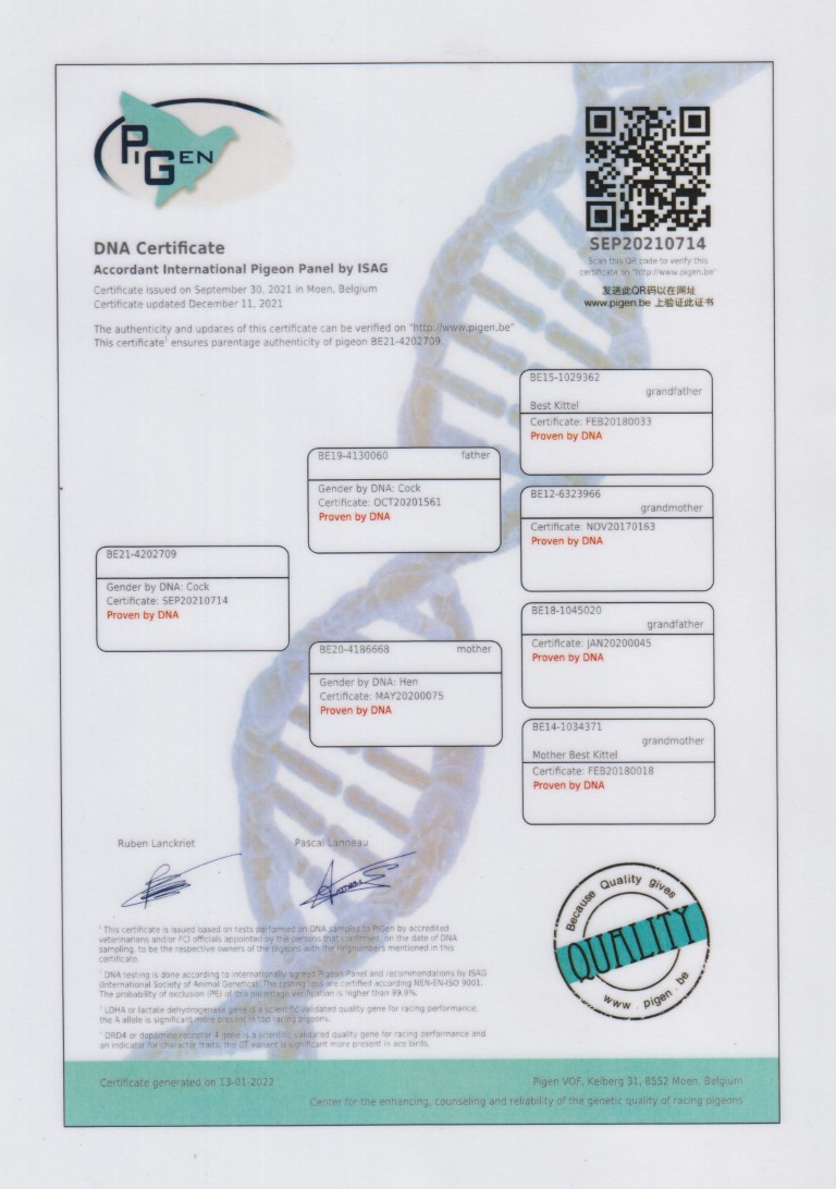 Grootmoeder: B14-1034371. Moeder ‘Best Kittel’, unieke kweekduivin.