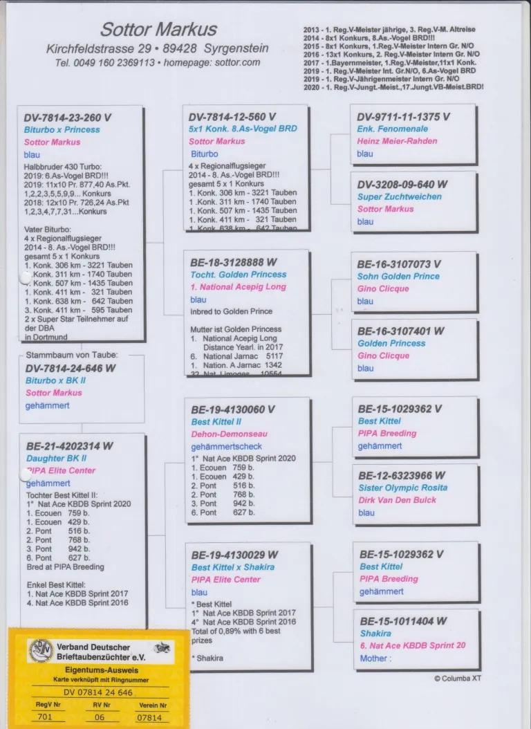 Uit: ”Biturbo x Princess”, 1/2 broer ”430 Turbo”, 6. Nat. Asduif Doffers Duitsland, uit kld. ”Golden Prince” x ”Daughter BK II”, dochter ”Best Kittel II”, 1. Nat. Asduif Sprint KBDB, uit dtr. ”Best Kittel”, 1. & 4. Nat. Asduif KBDB