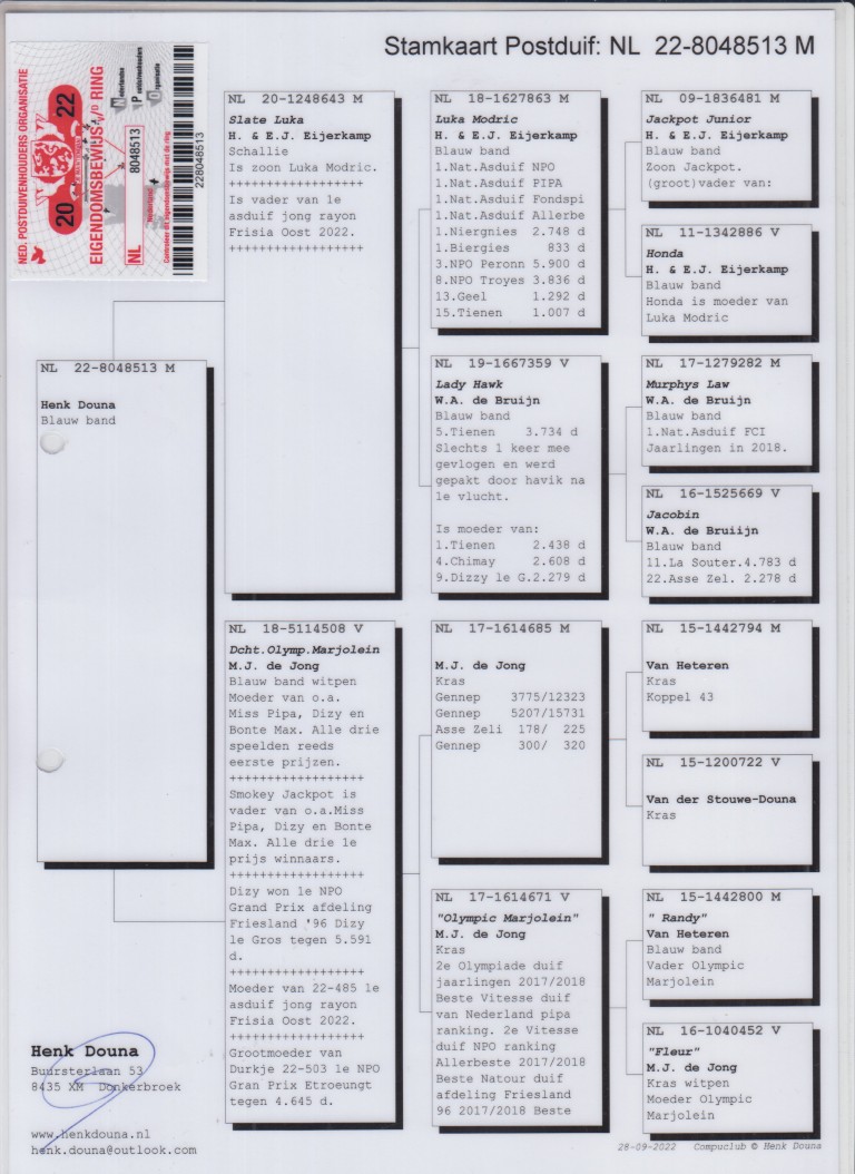 Uit: ”Slate Luka”, vader 1. Asduif Rayon Jonge, zoon ”Luka Modric”, 4x 1. Nat. Asduif Jonge Duiven, uit dochter ”Murphy’s Law” x ”Dtr. Olympic Marjolein”, dochter ”Olympic Marjolein”, 2. Olympiade duif