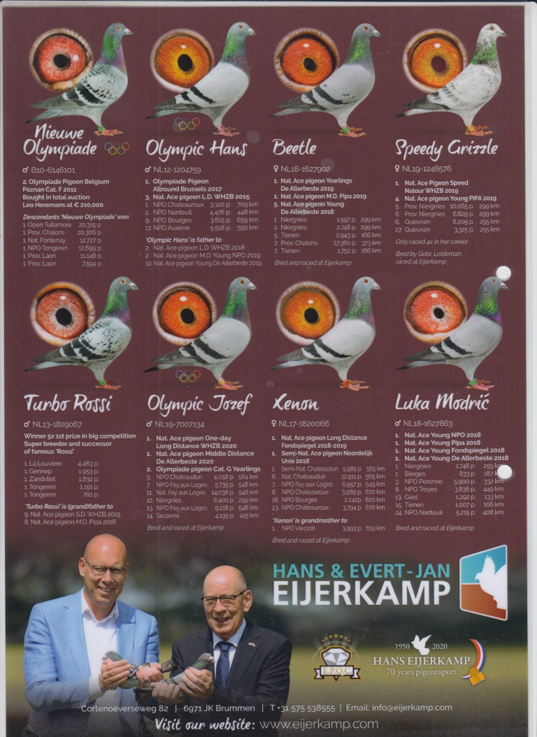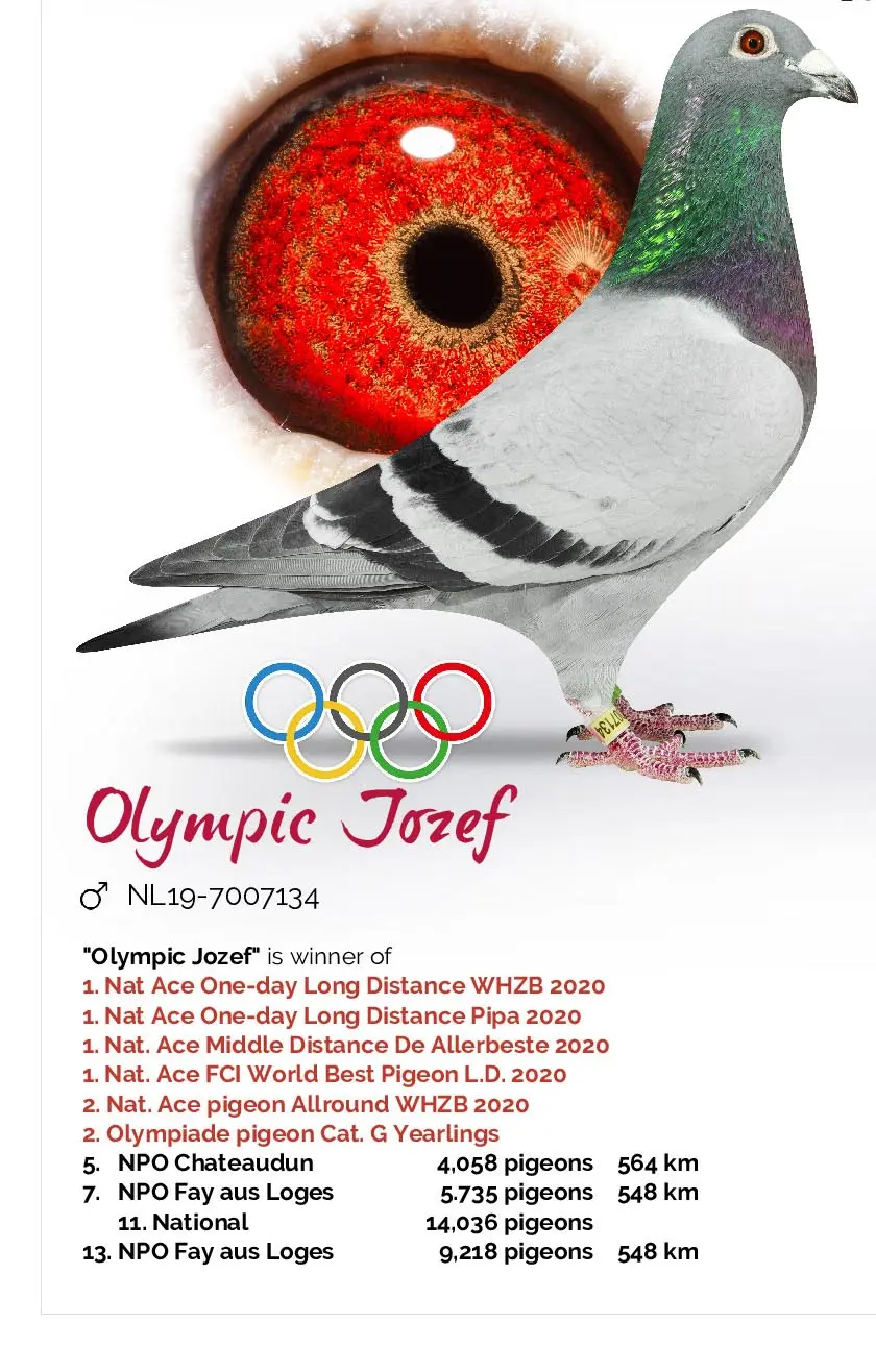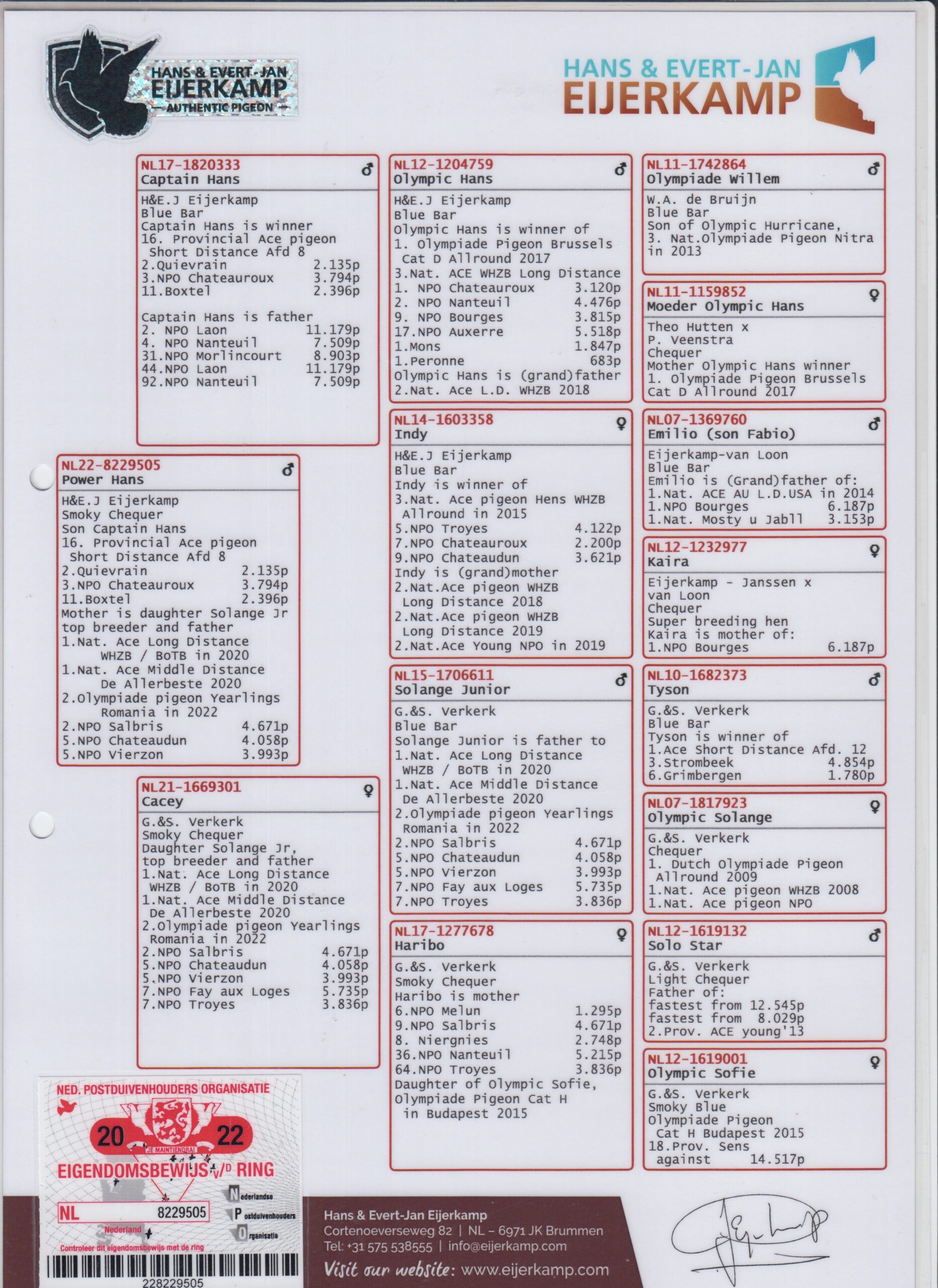 Uit: ”Captain Hans”, 16. Prov. Asduif, 2.-2.135 d., 3. NPO 3.794 d., vader 2. NPO 11.179 d., 4. NPO 7.509 d., zoon ”Olympic Hans” x ”Cacey”, 1/2 zus 1. Nat. Asduif Dagfond WHZB, 2. Olympiade duif, 2.-5.-5.-7.-7. NPO