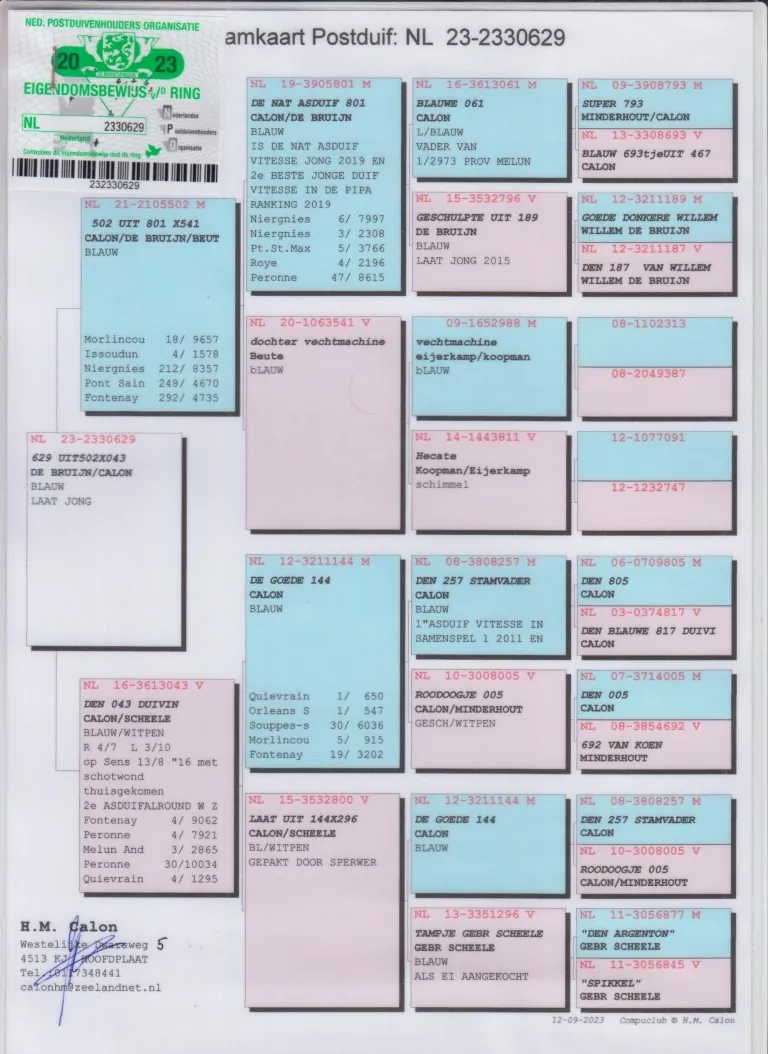 Uit: ”502 uit 801”, 4. Issoudun 1.578 d., 18. Morlincourt 9.657 d., uit dochter ”Vechtmachine”, zoon ”De Nat. Asduif 801”, 1. Nat. Asduif Vitesse Jong, 2. Nat. Asduif PIPA x ”Den 043 Duivin”, 3.-2.865 d., 4.-9.062 d., 4.-7.921 d.