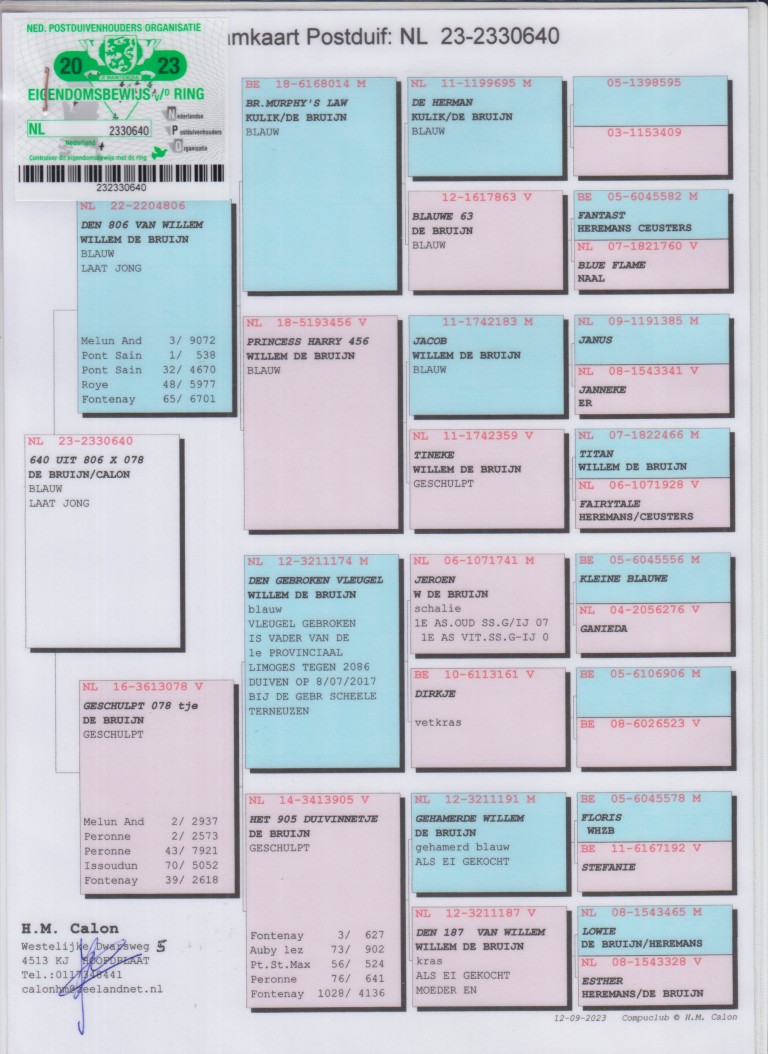 Uit: ”Den 806 van Willem”, 1.-538 d., 3. Prov. Melun 9.072 d., 100% Willem de Bruijn x ”Geschulpt 078 tje”, 2.-2.937 d., 2.-2.573 d., 1/2 zus 1. NPO Limoges 2.086 d., 75% Willem de Bruijn, uit zoon ”Jeroen”, 1. Asduif Samenspel