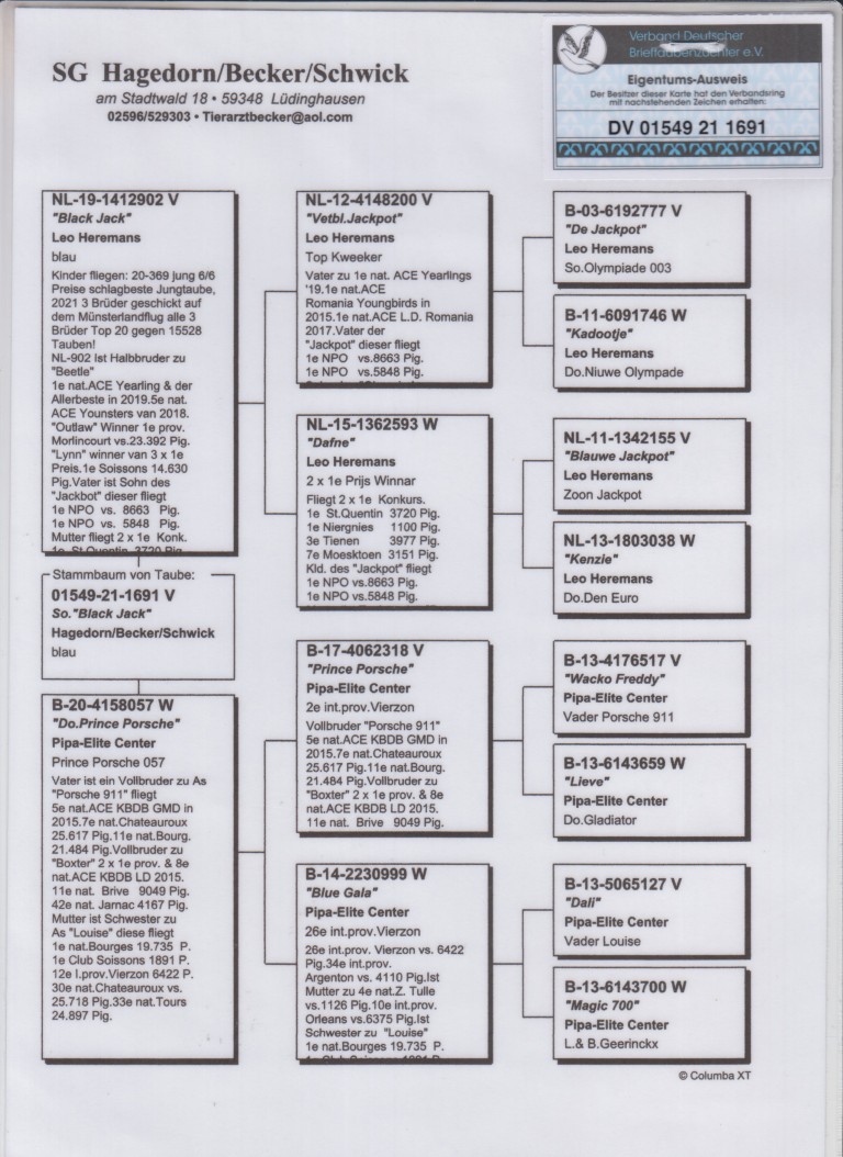 Uit: ”Black Jack”, 100% Leo Heremans & Superkweker, zoon ”Vetblauwe Jackpot”, Unieke kweker bij Eijerkamp x ”Do. Prince Porsche”, dochter ”Prince Porsche”, OLR Wonderkweker PEC & zoon ”Wacko Freddy” & ”Lieve”