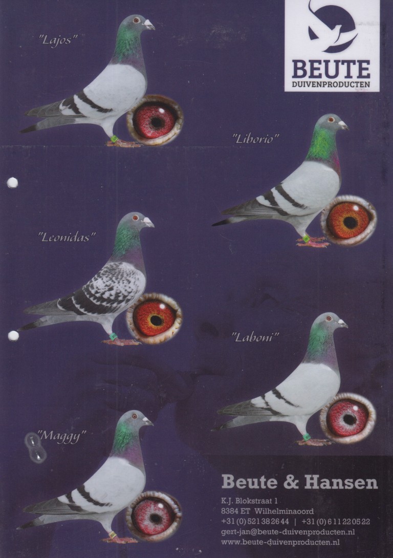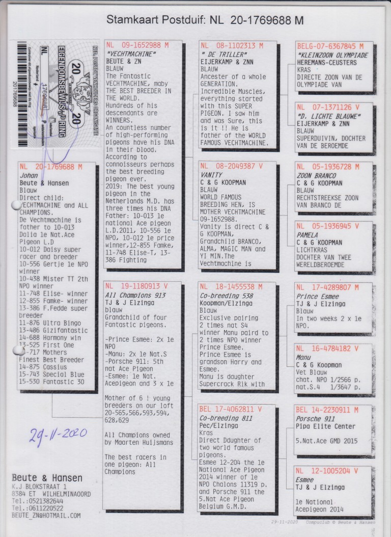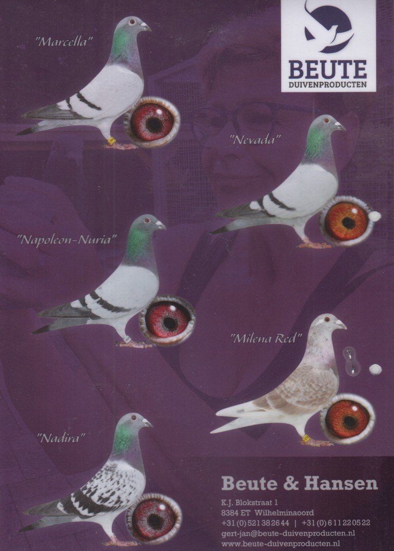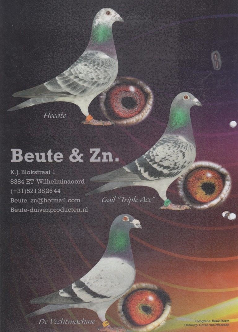 Uit: ”Vechtmachine”, Absolute stamvader en Nr. 1 kweker, nazaten winnen 1. Nat. Asduif Dagfond NPO, 1. Nat. Asduif Jonge Duiven Midfond NPO x “All Champions 913”, uit “Son Prince Esmee & Manu” & dochter “Porsche 911”.
