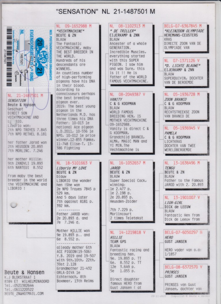Uit: ”Vechtmachine”, Absolute stamvader en Nr. 1 kweker, nazaten winnen 1. Nat. Asduif Dagfond NPO, 1. Nat. Asduif Jonge Duiven Midfond NPO x ”Liborio”, 2. NPO Troyes 7.845 d., 7.-8.181 d., gr-moeder 3.x 1. Prijs, 34. NPO Sourdun 6.673 d., etc.