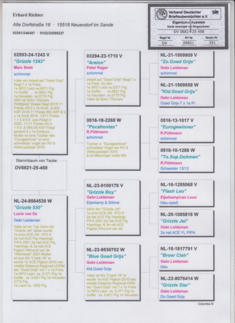 Uit: ”Grizzle 1243”, inteelt ”Goed Grijs”, 7x 1. Prijs & 1. NPO Laon 6.371 d., nazaten winnen 7x 1. Nat. Asduif x ”Grizzle 530”, inteelt ”Goed Grijs”, 7x 1. Prijs & 1. NPO Laon 6.371 d., nazaten winnen 7x 1. Nat. Asduif, lijn ”Claire”